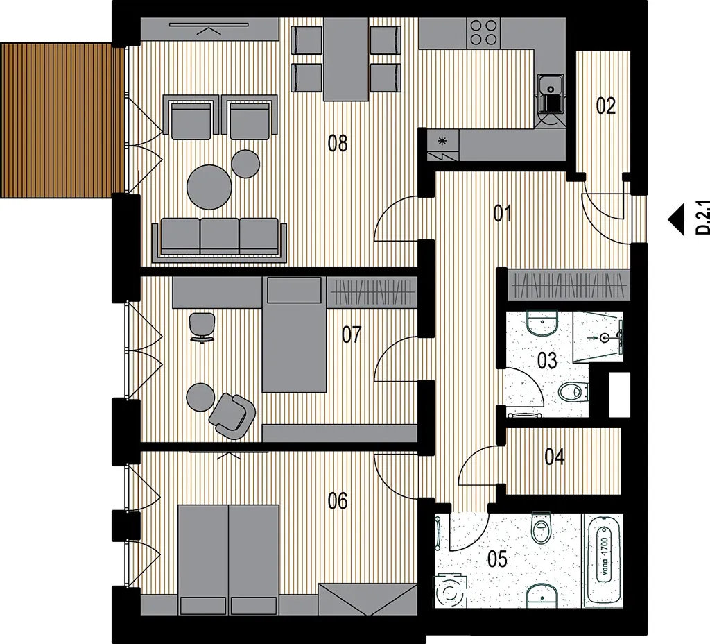 Byt, stejně tak jako celý projekt, je proveden ve vysokém standardu, a to co se materiálu i technologií týče.