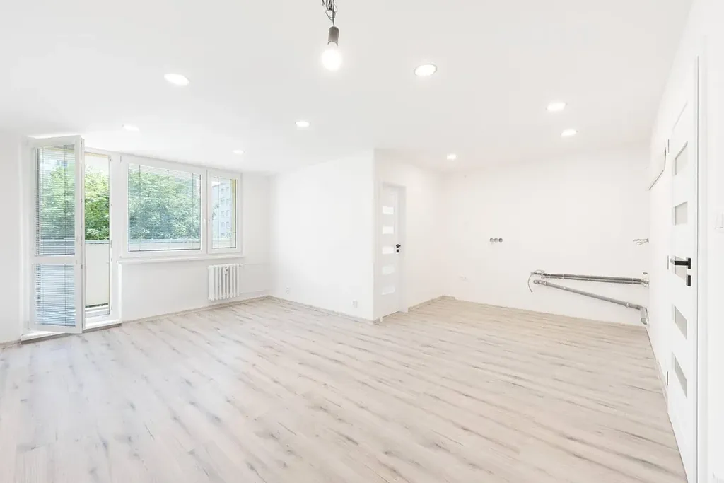 Byt působí velmi prostorným a svěžím dojmem. Nachází se zde velký obývací pokoj s kuchyňským koutem v jehož rohu je další oddělaná místnost, která lze využít jako pracovnu, či menší dětský pokoj, předsíně obsahující vestavěnou skříň, dva pokoje a moderní koupelnu se sprchovým koutem a oddělenou toaletou. Díky prostorné skříni v předsíni, případně sklepu se o úložný prostor bát opravdu nemusíte. Také jistě oceníte lodžii s výhledem do částečné zeleně. Ranní káva na čerstvém vzduchu je přece základ.