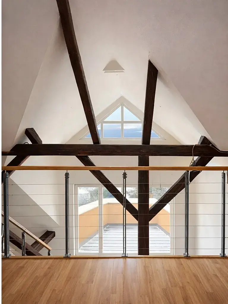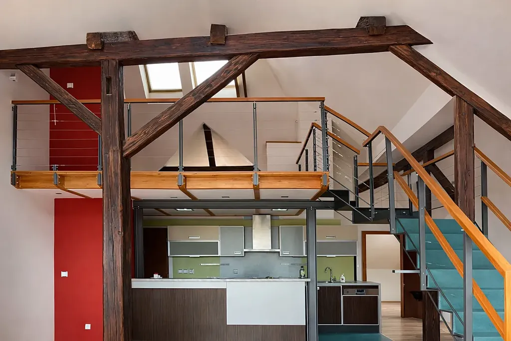 Dominantou bytu je prostorný obývací pokoj o výměře 56 m² s přímým vstupem na terasu a jedinečným výhledem na panorama města. Součástí obytného prostoru je kuchyňský a jídelní kout, přičemž kuchyň je plně vybavena spotřebiči včetně myčky, plynového sporáku, trouby, lednice a mrazáku. Obývací pokoj je orientován na jih, díky čemuž je byt příjemně prosvětlený po celý den. Z obývacího pokoje vedou schody do otevřeného podkrovního prostoru, který je přirozenou součástí obytné plochy. Nacházejí se zde krbová kamna a prostor je ideální pro relaxaci, čtení či klidovou zónu.
