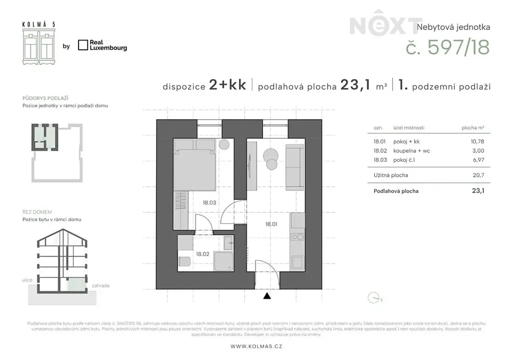Tato konkrétní jednotka č.18 o dispozici 2kk a podlahové ploše 23,1 m2 se nachází v 1 podzemním podlaží s výhledem do ulice. Přesné rozložení si můžete prohlédnout na přiloženém půdorysu. Vytápění je řešeno elektrickými přímotopy a ohřev vody elektrickým bojlerem.