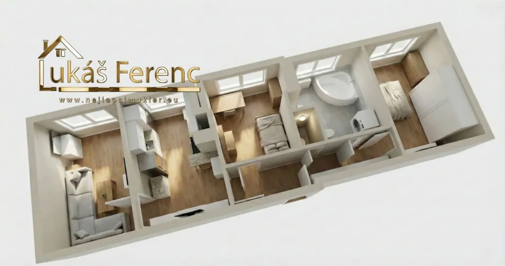 Vestavěné skříně, kuchyňská linka včetně el. trouby se sklokeramickou varnou deskou, digestoř, myčka nádobí, koupelna s rohovou vanou, další nábytek může být ponechán v bytě kompletní.