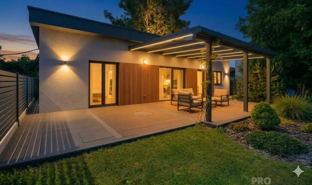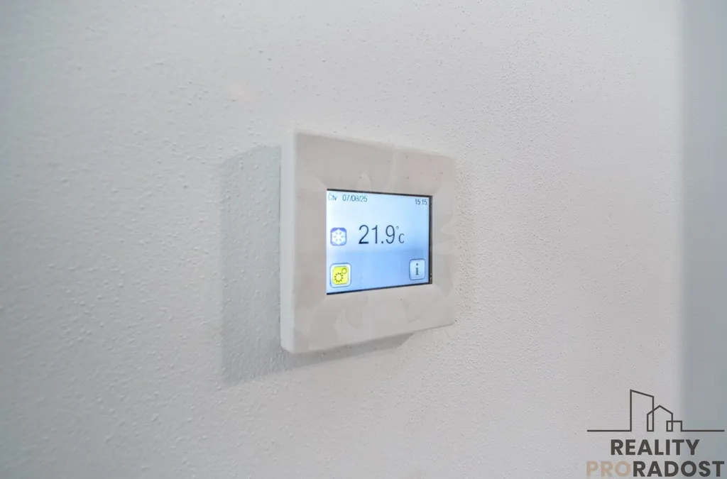 Kuchyně do tvaru U kombinuje dekor lesklé bílé a dřevodekoru. Nachází se zde indukční varná deska, elektrická trouba, granitový dřez v černé barvě s baterií, LED osvětlení horních skříněk. V koupelně se nachází walk-in sprchový kout, umyvadlová skříňka, úložné prostory, toaleta a příprava na pračku. Z obývacího pokoje je výstup na terasu, která je orientovaná do zahrady.