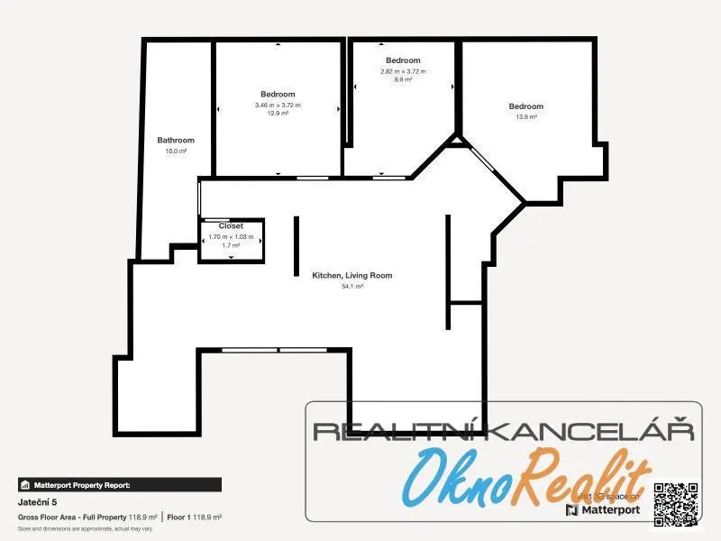 Realitní kancelář nabízí k prodeji velkoryse a moderně řešenou podkrovní bytovou jednotku na ul. Jateční v centru města Přerov, která je před dokončením. Dispozičně je byt řešen jako 4+kk a jeho výměra je 118 m2. Kuchyň je propojena s obývacím pokojem, výměra tohoto prostoru je 54,1 m2 a lze z něj vejít na zastřešenou terasu o výměře 7 m2. V kuchyni je nainstalována kuchyňská linka, varná deska, el. trouba, digestoř, myčka, mikrovlnná trouba a lednice. Ostatní pokoje mají výměru 13,9 m2, 12,9 m2 a 9,9 m2. Koupelna s obklady má výměru 10 m2, je vybavena sprchovým koutem, vanou 180 cm a dvěma umyvadly. WC je situováno samostatně a má výměru 1,7 m2. Podlahy v pokojích jsou plovoucí o tloušťce 8 mm. Vytápění bytu je elektrické sálavé - úsporné infra panely. V bytě nejsou nainstalovány vchodové a interiérové dveře, tyto si vybere nový majitel dle svého vkusu. K bytu náleží sklep o výměře 25 m2. Bytový dům, ve kterém se bytová jednotka nachází je po revitalizace. K bytové jednotce lze dokoupit parkovací stání ve dvoře za částku 250.000 Kč. V případě zájmu kontaktujte makléře nabídky.
