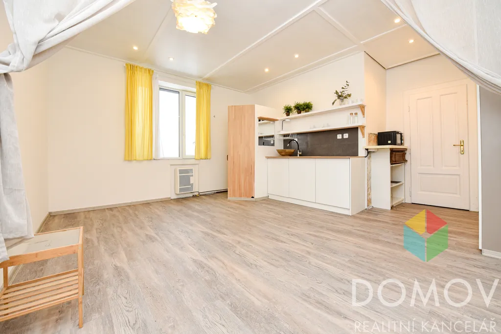 K bytu náleží i maličký balkonek, ideální na posezení s kávou a knihou. Z okna a balkonku se otevírá pohled na nízké okolní domy a zeleň za nimi. Vytápění je plynové, ohřev vody zajišťuje bojler, a k bytu náleží i sklepní koje – praktický prostor pro vše, co chcete mít po ruce, ale ne na očích. Parkování je možné na ulici před domem nebo ve dvoře.