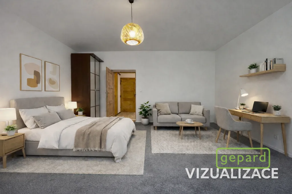 Dispozice bytu zahrnuje vstupní chodbu, samostatné WC, koupelnu s vanou, komoru, prostornou kuchyni, ve které je dostatek místa i pro jídelní kout nebo pracovní místo, a samostatný pokoj o výměře přes 20 m². K bytu náleží nadstandardní sklep o výměře více než 4 m².