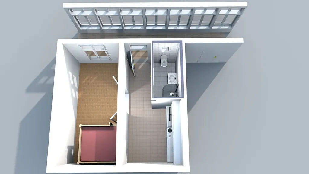 Byt je situovaný do vnitrobloku, okno z pokoje je na pavlač. Byt je v dobrém stavu, vybavení bytu tvoří pouze kuchyňská linka se sporákem se sklokeramickou varnou deskou, myčka nádobí a patro na spaní. Topení a ohřev teplé vody je řešený kombinovaným plynovým kotlem.
