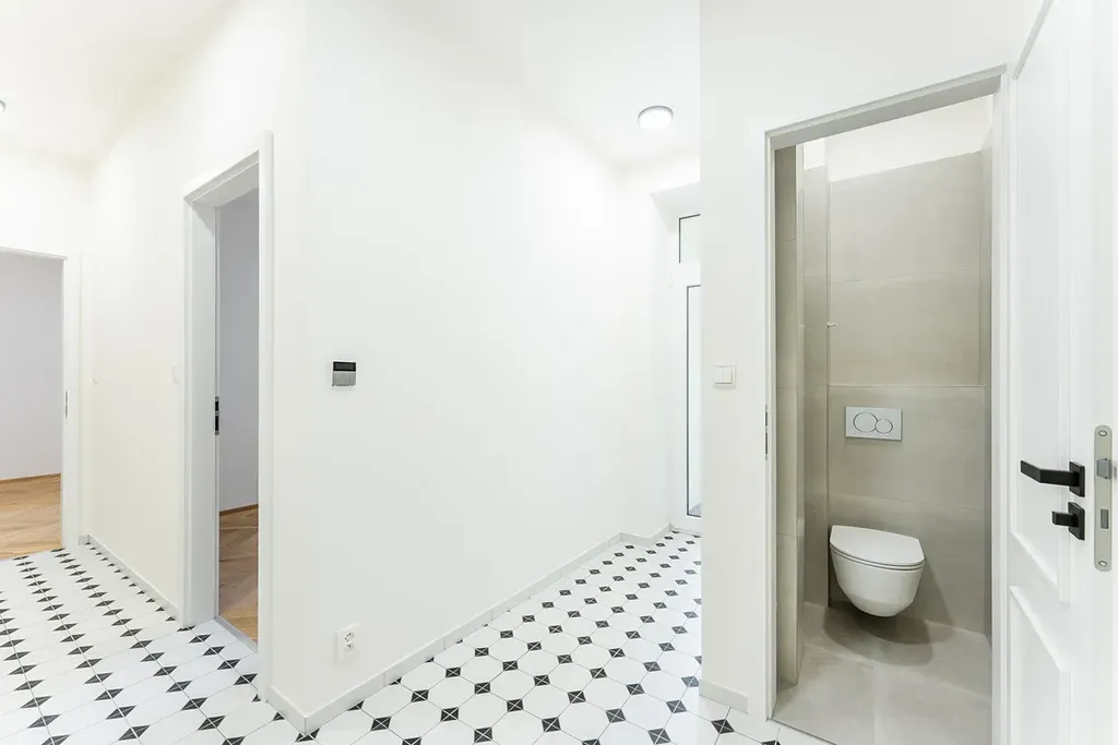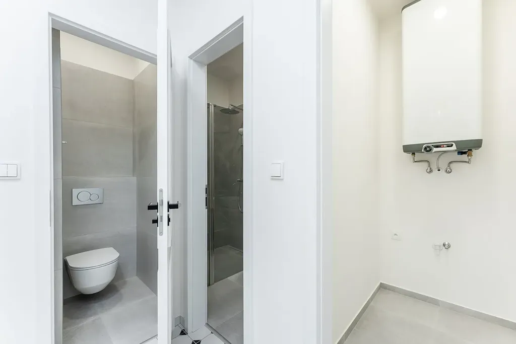 Byt sestává ze vstupní haly s dostatkem místa pro botník či šatní skříň. Dále technická místnost, ideální pro pračku a jako další úložný prostor. Samostatná koupelna se sprchovým koutem. Oddělená toaleta pro větší komfort.