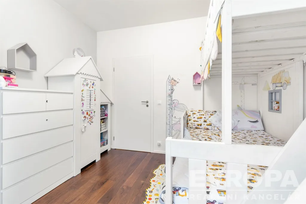 Interiér bytu byl kompletně realizován na míru s důrazem na kvalitu, funkčnost a nadčasový design. Nemovitost se prodává plně vybavená zakázkovým nábytkem, nový majitel tak může bydlet okamžitě bez jakýchkoliv dalších investic. Kuchyňská linka je osazena kvalitními spotřebiči značek BOSCH a SIEMENS, doplněna o vestavěnou vinotéku. Obývací část nabízí elegantní televizní stěnu s elektrickým krbem, který dotváří příjemnou atmosféru celého prostoru.