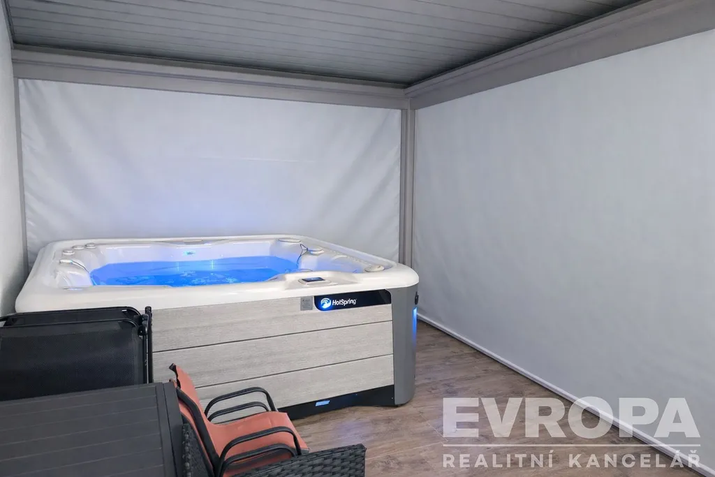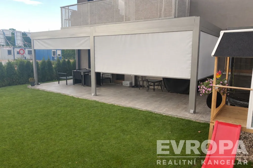 Jedním z hlavních lákadel této nemovitosti je unikátní venkovní prostor. K bytu náleží terasa o ploše 33 m² s velkou bioklimatickou pergolou vybavenou screenovými roletami a LED osvětlením. Na ní navazující soukromá zahrada o velikosti 100 m². Zahrada je automaticky zavlažována, osázena tújemi a udržována robotickou sekačkou. Součástí zahrady zůstává také prostorná úložná bedna a dětský zahradní domek.