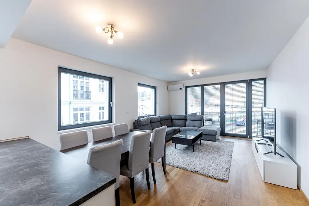 Dispozice: vstupní chodba, obývací pokoj s kuchyňským koutem a vstupem na terasu, 3 ložnice (jedna s balkonem), 2 koupelny (vana i sprchový kout), samostatná toaleta, komora. Vestavné skříně, pračka, sušička, klimatizace.