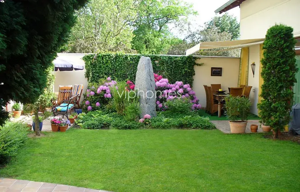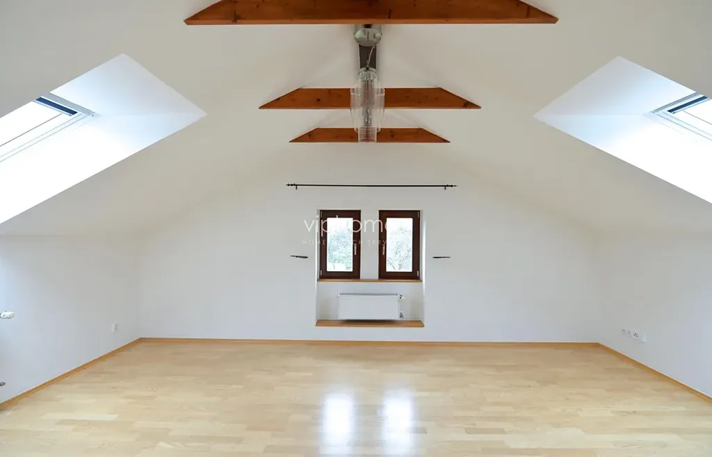 V přízemí bytu se nachází společenská část bytu, kuchyň otevřená do obývacího pokoje (49 m2) se vstupy na terasu a zahrádku, WC, šatna, komora a technická místnost. Klidová zóna v patře nabízí hlavní ložnici, velkou koupelnu s vanou, sprchou a WC, další dvě ložnice, galerii a úklidovou místnost.