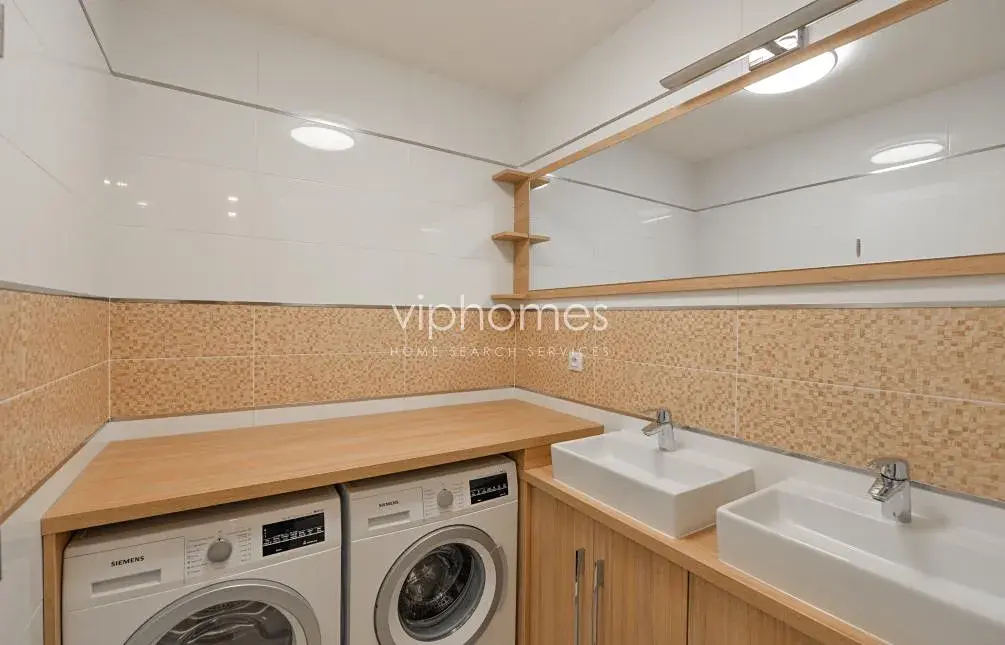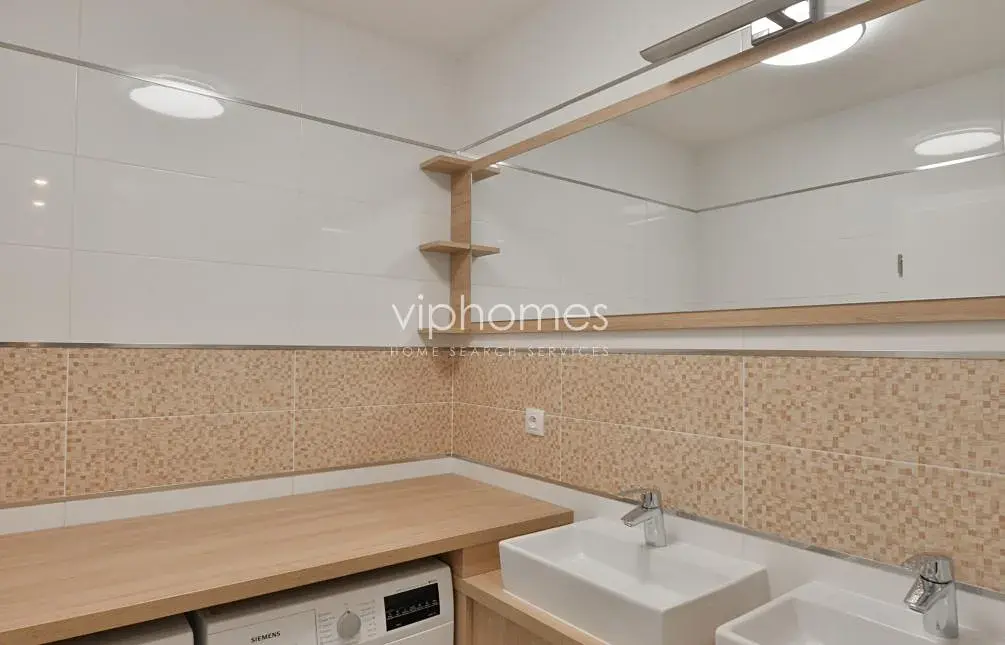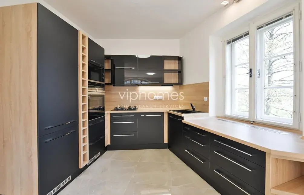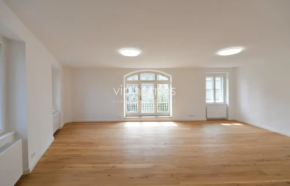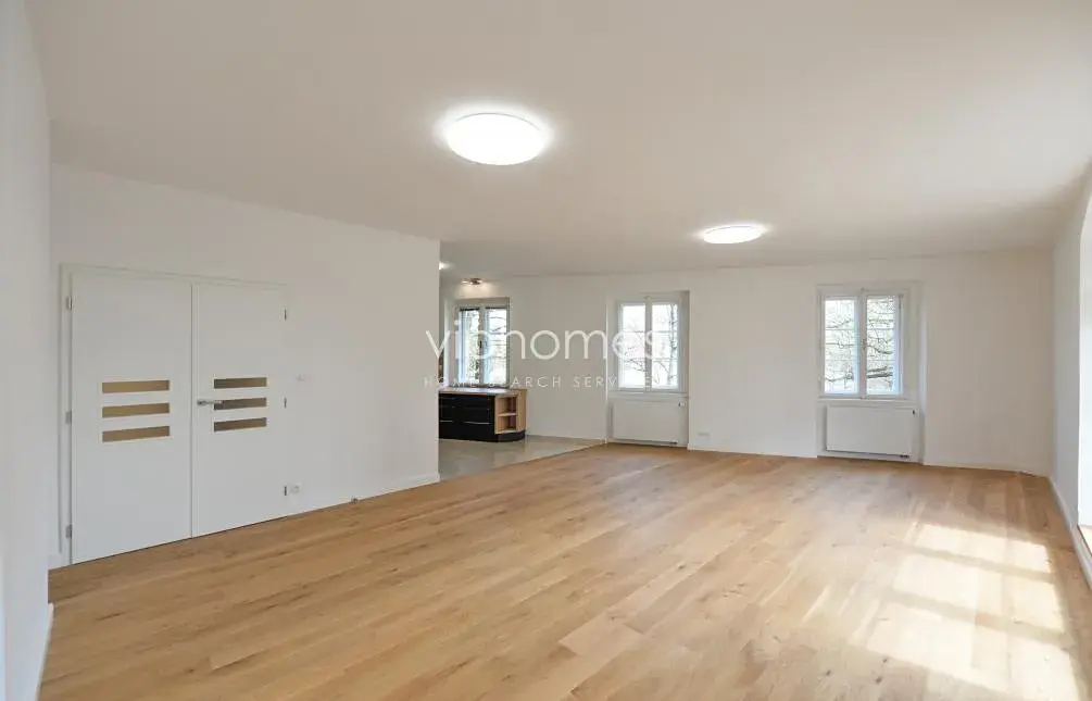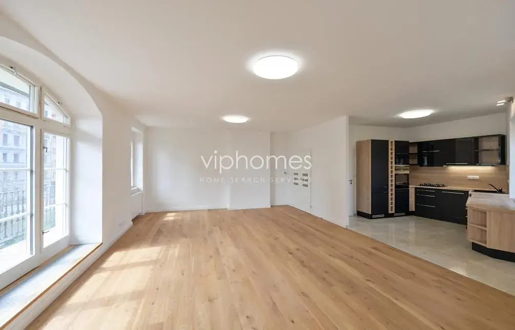 Dominantou bytu je slunný obývací pokoj s moderní kuchyní, plně vybavenou všemi potřebnými spotřebiči, vstupem na terasu, velkými okny poskytujícími neopakovatelné výhledy na Národní divadlo a nábřeží. Interiér bytu dále nabízí prostornou vstupní halu, dvě koupelny, samostatnou toaletu, 4 ložnice, šatnu, komoru. V ceně nájmu je i garáž a parkovací místo, sklepní kóje.