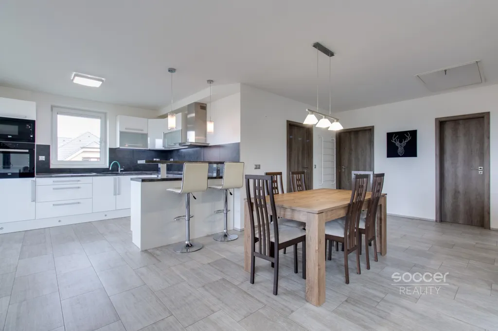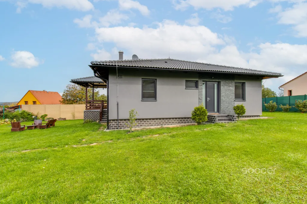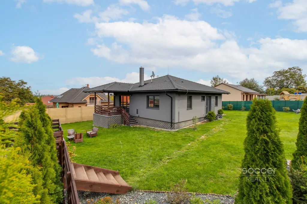 Rodinný dům typu bungalov byl zkolaudován v roce 2016 a nabízí užitnou plochu cca 124 m², přičemž podlahová plocha obytné části činí přibližně 100 m². Dům je situován na pozemcích o celkové výměře 998 m², z toho zahrada o výměře 860 m², a obklopuje jej udržovaná zeleň s okrasnými dřevinami zajišťujícími dostatek soukromí. Součástí domu je zastřešená terasa přístupná přímo z obývací části, ideální pro posezení i relaxaci.