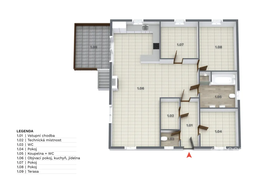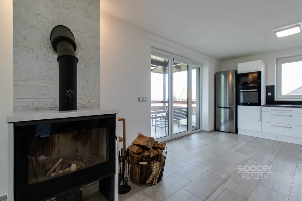 Při vstupu do domu se po levé straně nachází samostatné WC, po pravé straně jeden z pokojů. Dále je zde technická místnost s elektrickým kotlem a prostorem pro pračku a sušičku. Dominantou domu je centrální obytný prostor propojující obývací část, kuchyňský kout a jídelnu. Atmosféru obytného prostoru dotvářejí krbová kamna na dřevo, která mohou sloužit i jako doplňkový zdroj tepla. Z této části je vstup na půdu využitelnou jako úložný prostor a dále do dalších dvou pokojů. K dispozici je koupelna s vanou, sprchovým koutem a druhým WC.