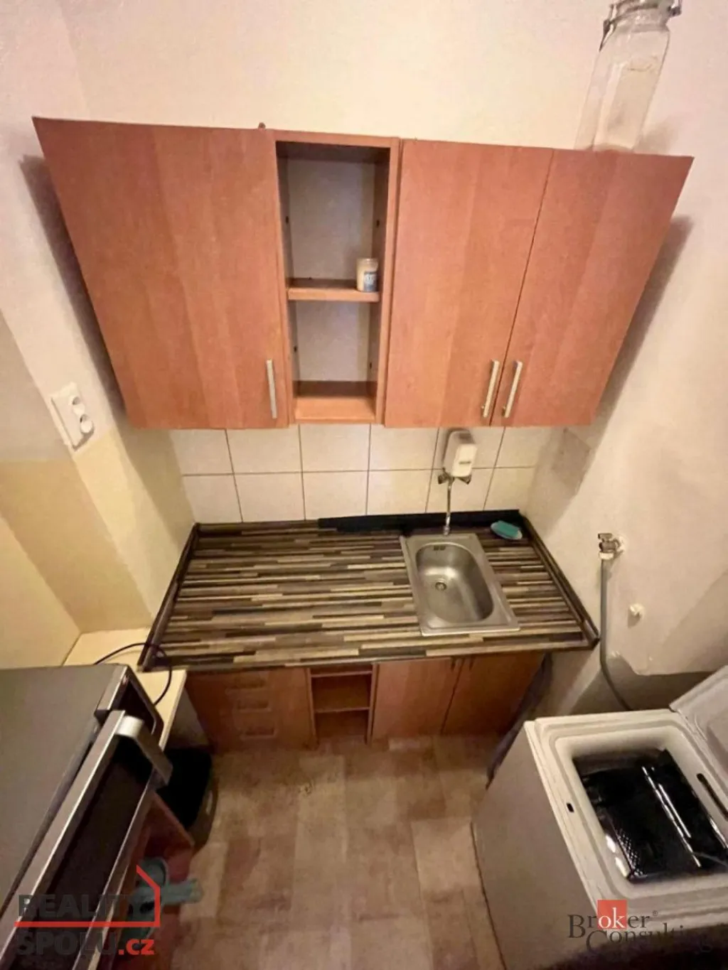 Dispozice bytu: Za vstupními dveřmi se nachází předsíň se třemi vstupy – do hlavní obytné místnosti, samostatné kuchyňky s kuchyňskou linkou a do koupelny. Hlavní pokoj je vybaven praktickým dřevěným patrem na spaní a vstupem do menší komory, která poslouží jako úložný prostor. Koupelna disponuje vanou, WC a elektrickým žebříkem. Ohřev vody zajišťuje nový elektrický bojler, vytápění je centrální.