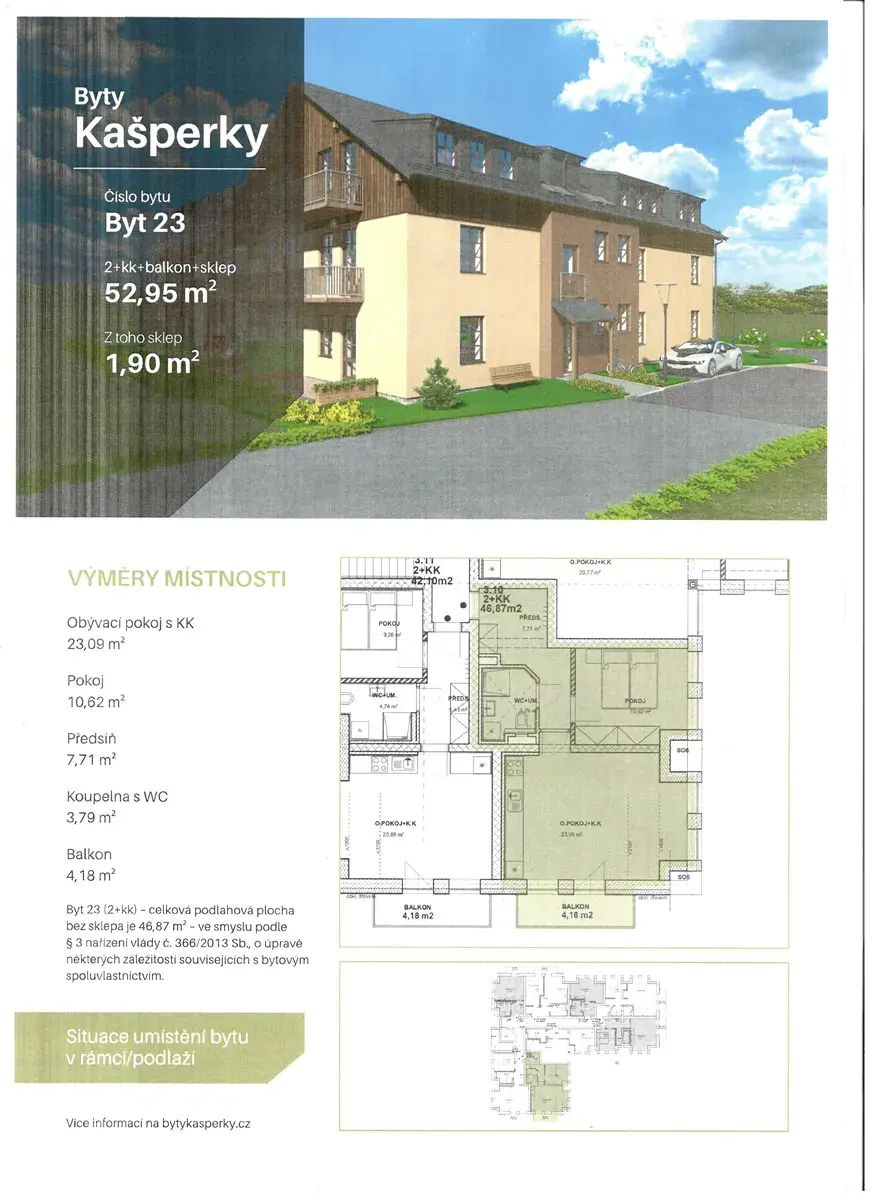 Nabízíme Vám k prodeji nový byt o velikosti 2+kk+balkon označený jako byt 23, nacházející se ve 3. NP o celkové ploše včetně balkonu a zděného sklepa 52,9 m2, který bude stavěn v rámci projektu Byty Kašperky ve velmi klidné části Kašperských Hor v ul. Česká s výhledem na okolní krajinu a přitom v docházkové vzdálenosti od centra Kašperských Hor.