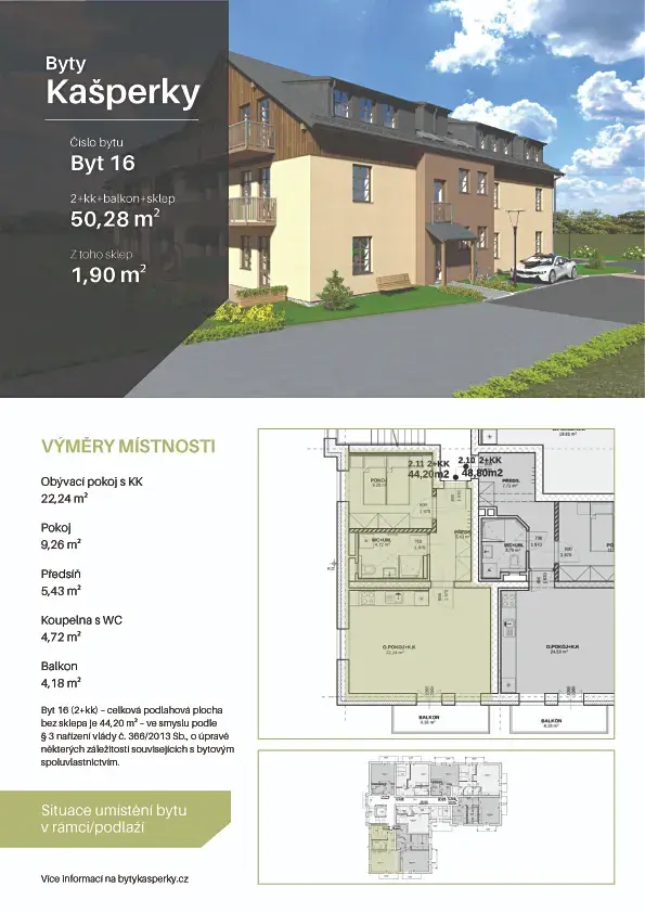 Nabízíme Vám k prodeji nový byt o velikosti 2+kk+balkon označený jako byt 16, nacházející se ve 2. NP o celkové ploše včetně balkonu a zděného sklepa 50,3 m2, který bude stavěn v rámci projektu Byty Kašperky ve velmi klidné části Kašperských Hor v České ul. s výhledem na okolní krajinu a přitom v docházkové vzdálenosti od centra Kašperských Hor.