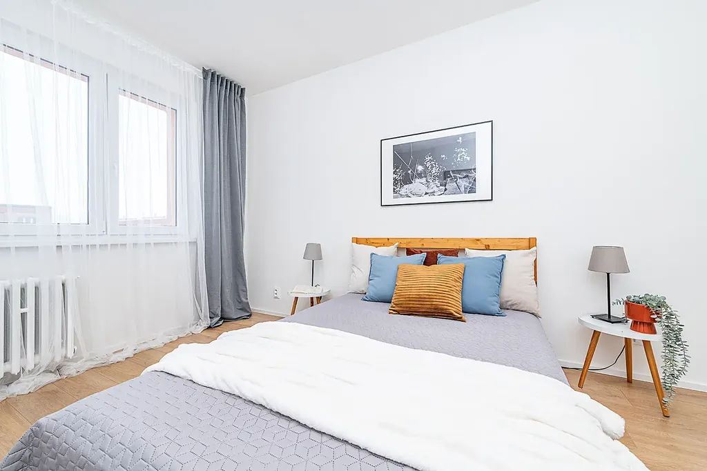 Dispozici bytu tvoří dvě neprůchozí ložnice, velkorysý obývací pokoj spojený s kuchyní, prostorná koupelna se sprchovým koutem a samostatný záchod.