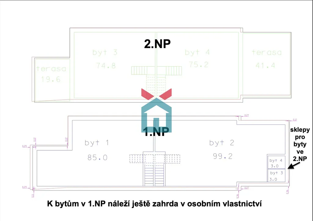 V 1. NP jsou dvě jednotky s vlastními zahradami.