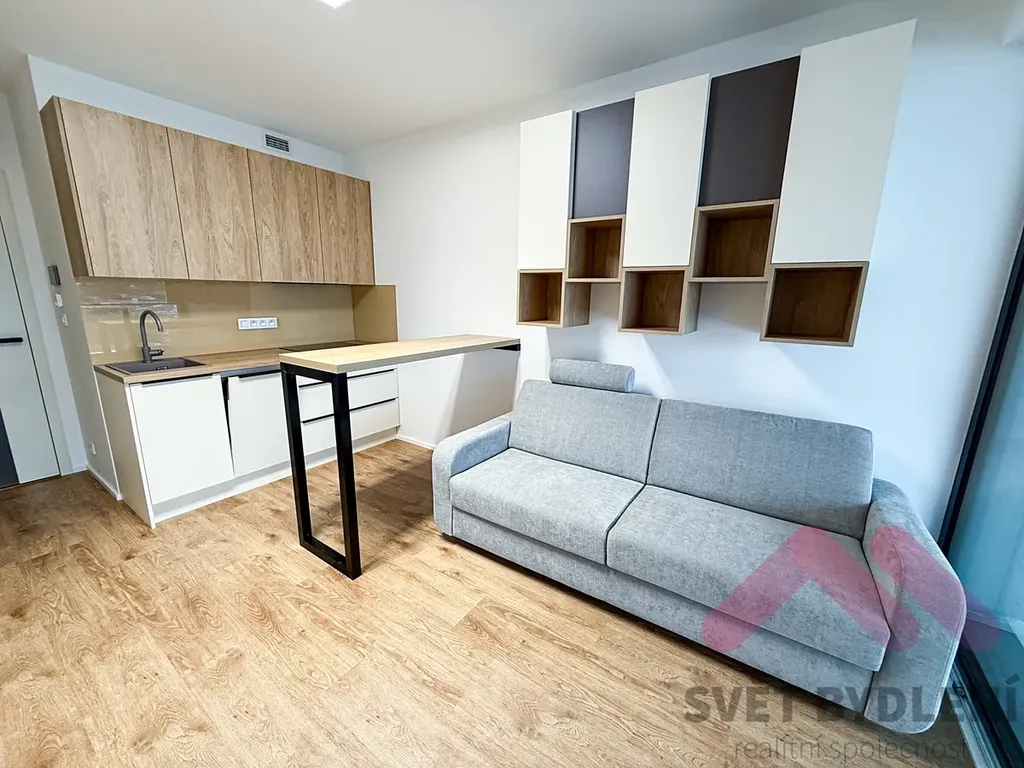 Naše společnost si Vám dovoluje nabídnout luxusní byt, který se nachází v 3.patře s výtahem právě dokončené novostavby projektu Parková čtvrť, která je provedena ve vysokém standartu (vyhřívané podlahy, předokenní žaluzie, klimatizace, rekuperační jednotka, zabezpečovací systém Jablotron). Byt o celkové užitné ploše 33m2 (26m2 byt + 7m2 terasa) je vybaven kuchyňskou linkou s vestavěnými spotřebiči zn. Electrolux (lednička, myčka, mikrovlnná trouba, indukční varná deska, horkovzdušná trouba) a vestavěné skříně v předsíni a dále kvalitní rozkládací sedací soupravou a pračkou se sušičkou. K bytu náleží sklepní kóje, která je umístěna v suterénu domu.