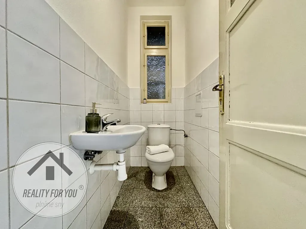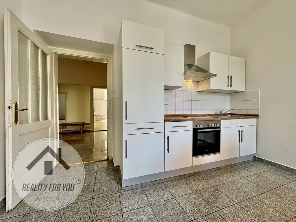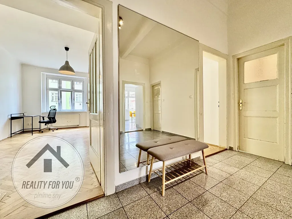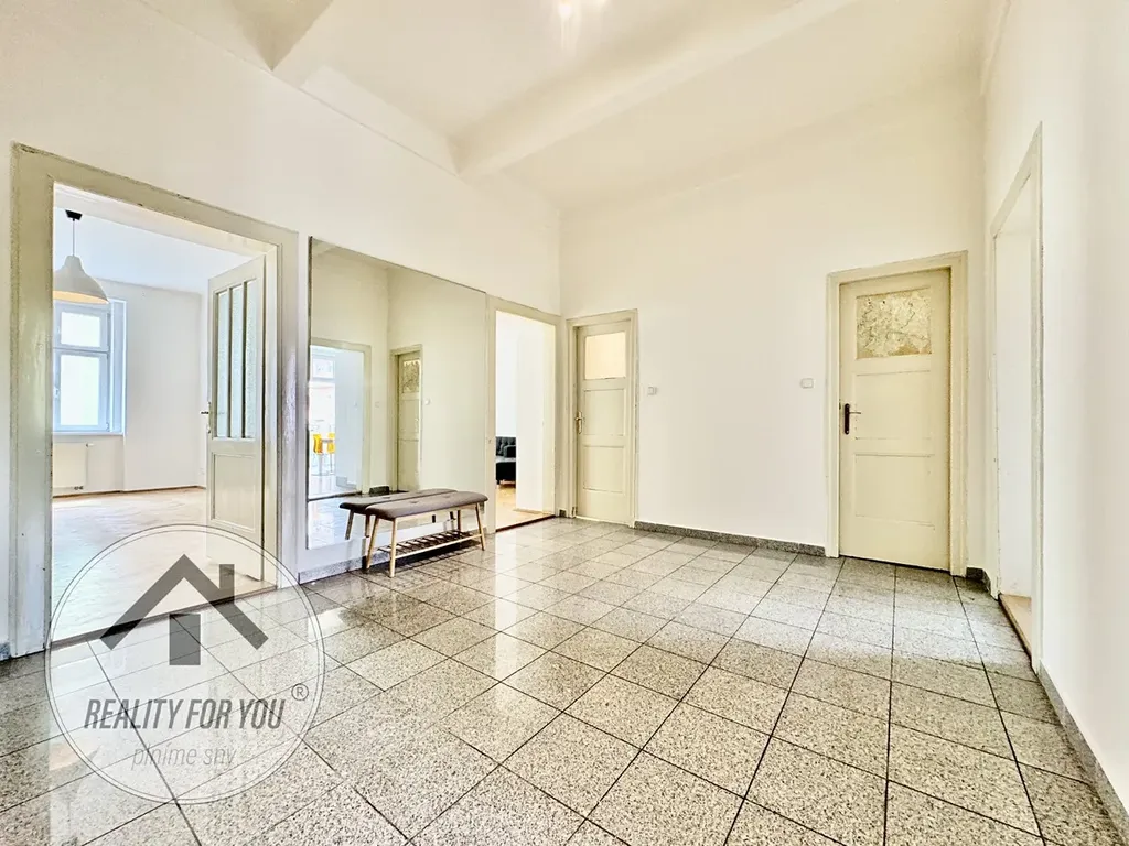 Velkorysá vstupní hala je centrální částí bytu. Máme zde jednu samostatnou a dvě průchozí ložnice/pokoje. Průchozí ložnice jsou od sebe odděleny původními šoupačkami. Může zde vzniknout např. obývací pokoj s pracovnou či po změně dispozice kuchyň s obývací částí a samostatná ložnice. Kuchyň s moderní kuchyňskou linkou má vlastní komoru a vstup na balkon, který je situován do klidného vnitrobloku. Koupelna s vanou a samostatná toaleta.