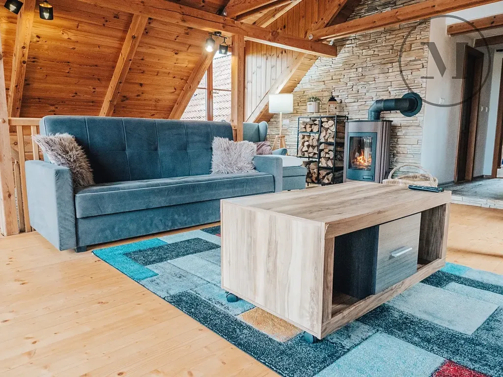 Interiér je světlý a vzdušný, s důrazem na výhledy do okolní přírody. V horním patře se nachází útulný obývací pokoj s krbovými kamny, který vytváří příjemnou atmosféru a přirozené centrum domu. Dispozice nabízí dostatek prostoru pro každodenní život i soukromí jednotlivých členů rodiny.