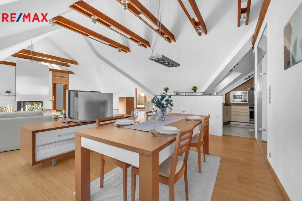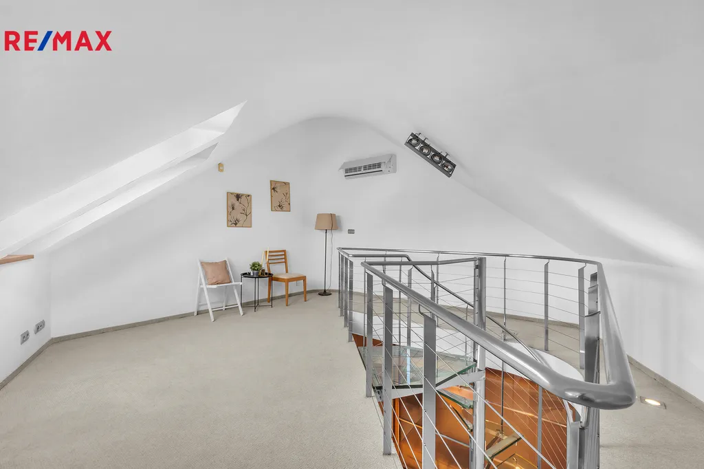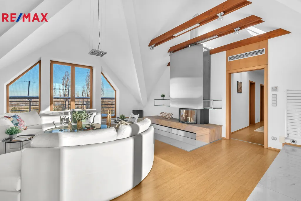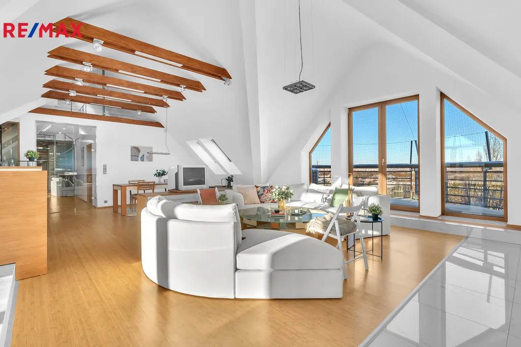 Nabízíme k prodeji nadstandartní, zcela atypický podkrovní byt o obytné podlahové ploše 219 m2 a celkové podlahové ploše 278 m2. Bytová jednotka 5kk je umístěna v šestém podlaží (podkroví) na adrese Praha 10, Za Kovárnou, Dolní Měcholupy, a je částečně vybavena. Dolní Měcholupy mají veškerou občanskou vybavenost: lékař, školka, škola, nákupní centrum. Autobusová zastávka je téměř u domu. Volnou chůzí +- 2 minuty se spojením na metro Skalka trasa A. Součástí bytu jsou dvě terasy 4 a 14,7 m2. Dále k bytu náleží kryté garážové stání pro jedno osobní vozidlo. Výtah je k dispozici od parkovacích stání přímo ke vchodovým dveřím bytu.