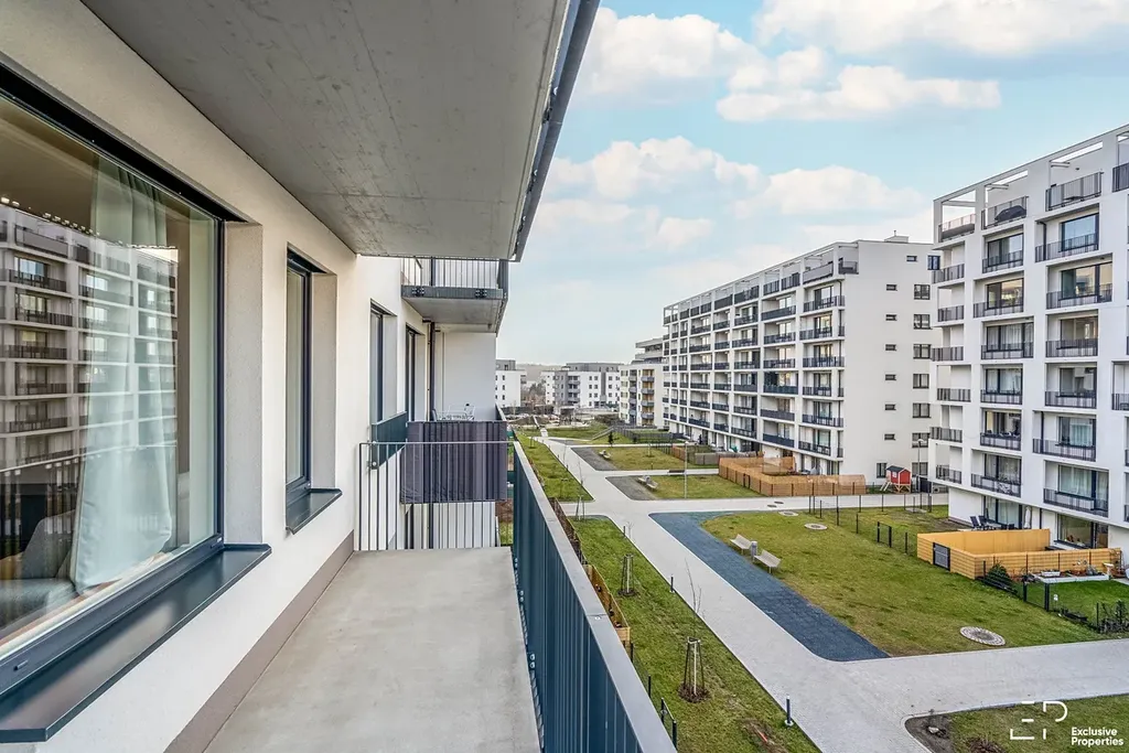 Z obývacího pokoje se vychází na prostorný balkón, který je ideální na kávu, knížku nebo večerní sklenku vína. Výhled směřuje do vnitrobloku, takže působí klidně a příjemně.