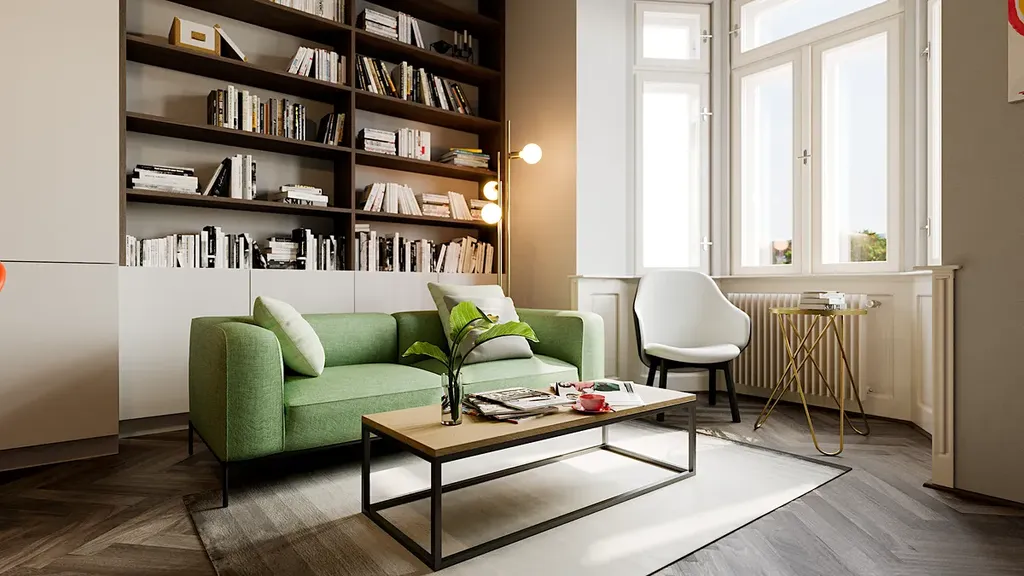 Interiér je navržen v moderním skandinávském stylu s důrazem na světlé barvy, přírodní materiály a precizní zpracování. Dubové parkety v rybinovém vzoru, velkoformátová dlažba s betonovým vzhledem a šedo-zelené truhlářské detaily podtrhují klidnou eleganci severského designu.