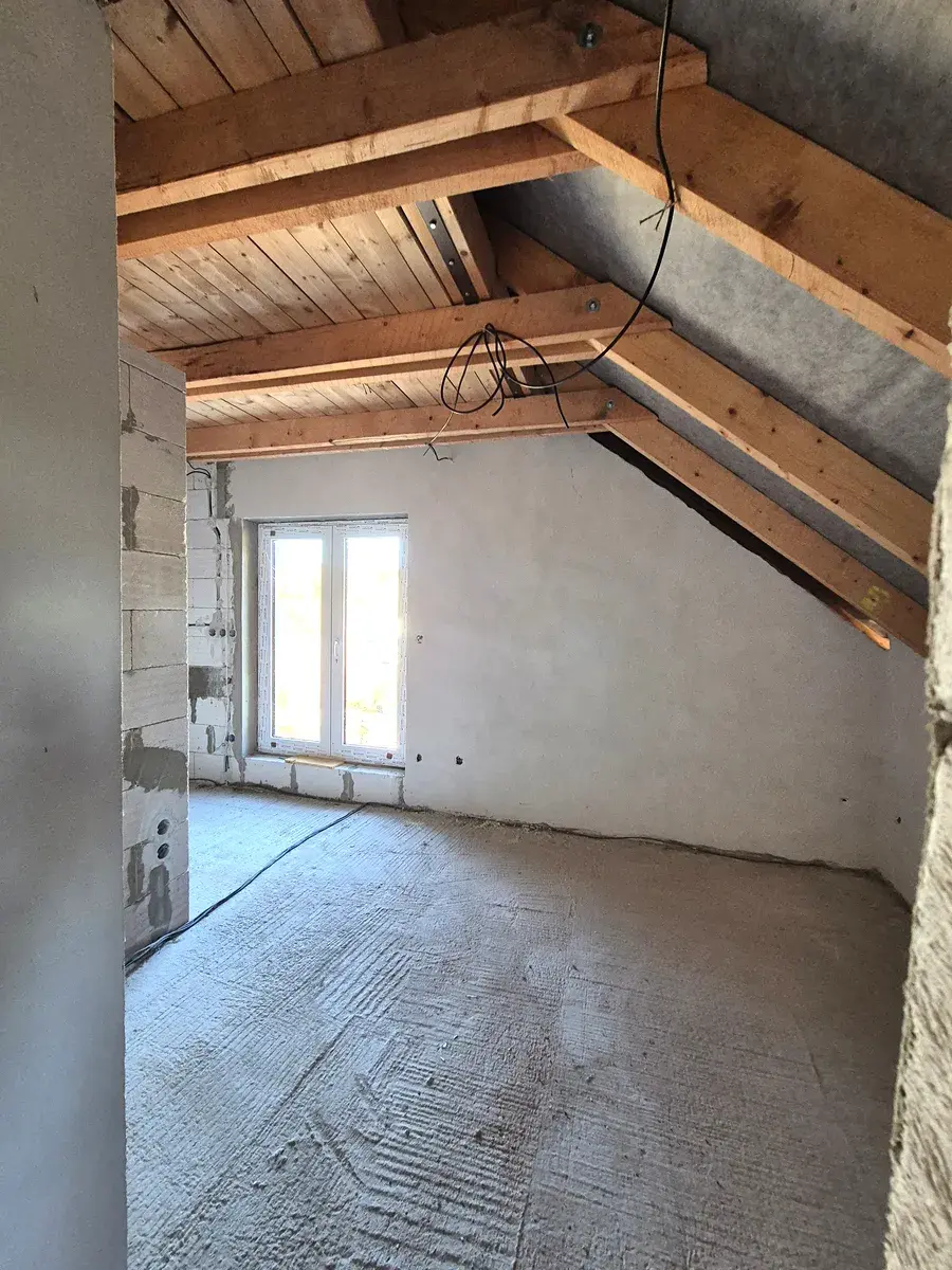 Dům je postaven z Ytongových tvárnic s tepelně izolačními vlastnostmi tl.45cm přičemž přízemí je dokončené a obyvatelné, v podkroví jsou pouze příčky pokojů ze zdících tvarovek a zateplená střešní konstrukce z minerální plsti. Dům má dispozici šesti pokojů a kuchyňského koutu. Dominantou přízemí je obývací pokoj propojený s jídelním a kuchyňským koutem se vstupem na zahradu. Vzhledem k jižní orientaci je tento prostor dostatečné prosvětlený a vzdušný. V obývacím pokoji se nachází krbová kamna se sklem a nabízí se tak možnost příjemného posezení s pohledem na oheň a zároveň s možností vytápění domu. V přízemí se dále nachází ložnice, samostatný pokoj, předsíň se schodištěm do patra, koupelna se sprchovým koutem a WC a technická místnost. V podkroví je připravena dispozice tří samostatných pokojů a velké koupelny ve stavu hrubé stavby. Tento stav může být výhodou pro vlastní realizaci designového provedení.