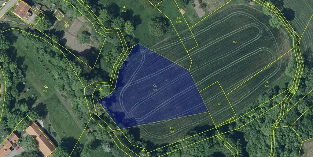 - Parcelní číslo 13/1 (3680 m², 100% podíl, LV 1147)