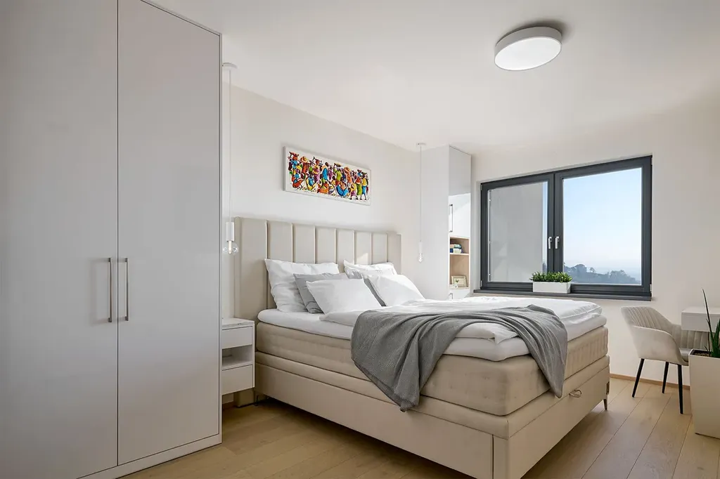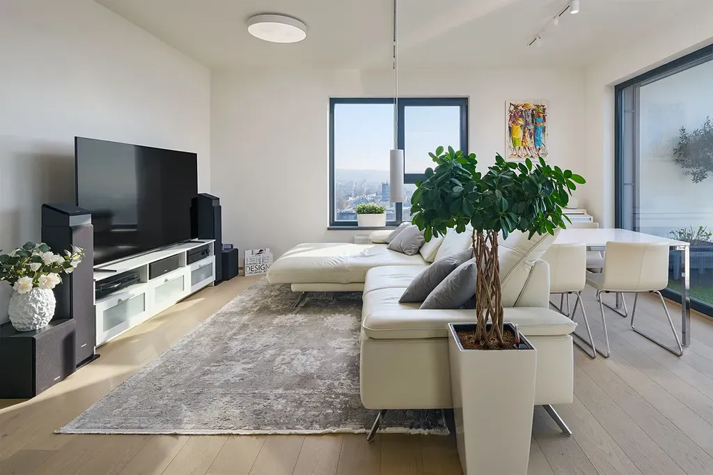 Velkoformátová dlažba, sanita prémiové úrovně, kompletní osvětlení Philips Hue, klimatizace ve všech místnostech, 3M solární fólie, dálkově ovládané žaluzie, sítě proti hmyzu, kamerový rozvod v bytě i na lodžii.