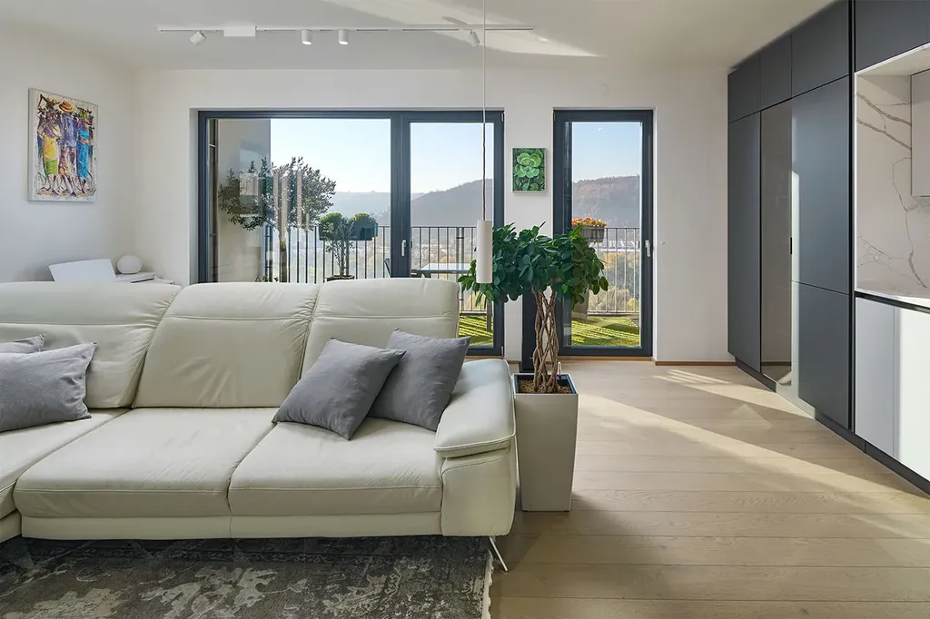 Díky rohovému umístění a absenci sousedů vás obklopí ticho a výhled, který se mění s denním světlem. Dispozice bytu byla promyšleně upravena a při výběru příplatkových materiálů se rozhodně nešetřilo. Výsledek? Jeden z nejhezčích bytů v celých Modřanech – promyšlený do posledního detailu.