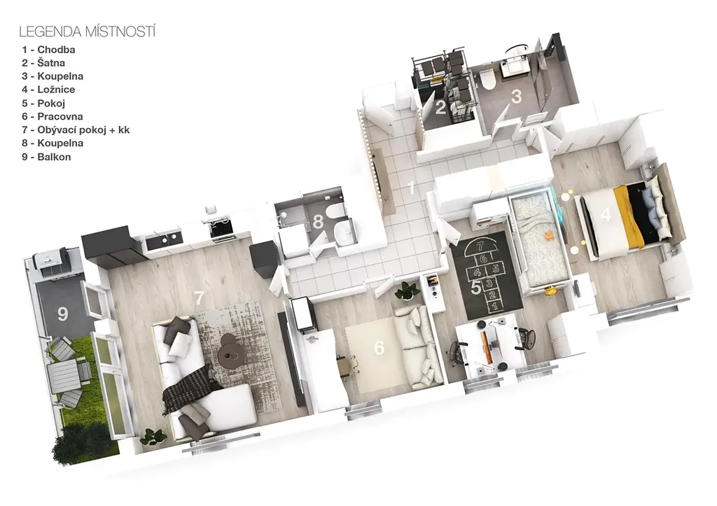 Tady je to jiné. V posledním patře projektu Zahálka máte na jedné straně hřiště přímo pod sebou a na druhé tramvajovou zastávku vzdálenou jen pár kroků. To nejlepší z obou světů – příroda i město, bez kompromisů.