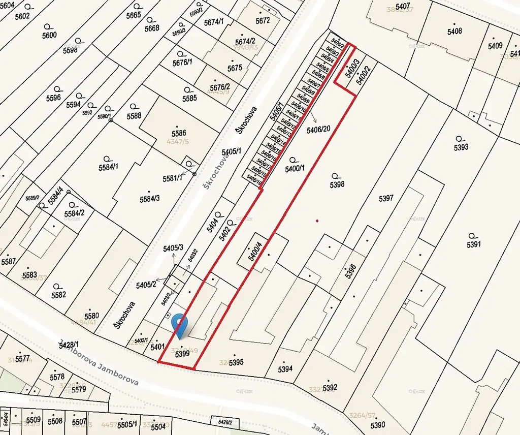 Celková plocha pozemku je velkorysých 946 m2. Obrovskou výhodou je, že dům má vyhrazený obslužný vjezd z ulice Jamborova. Z ulice Škrochova je součástí prodeje samostatná garáž, která navazuje na nabízený pozemek.