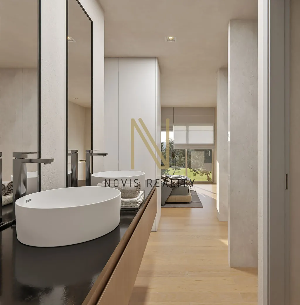 Interiérové vybavení: velkoformátové porcelánové podlahy v obytných prostorách, laminátové podlahy v ložnicích, keramická dlažba v koupelnách, lakované hliníkové dveře a okna s dvojitým zasklením, motorizované žaluzie, kuchyně s vestavěnými spotřebiči (lednice, indukční deska, trouba, myčka), moderní toalety s porcelánovými umyvadly a chromovými bateriemi