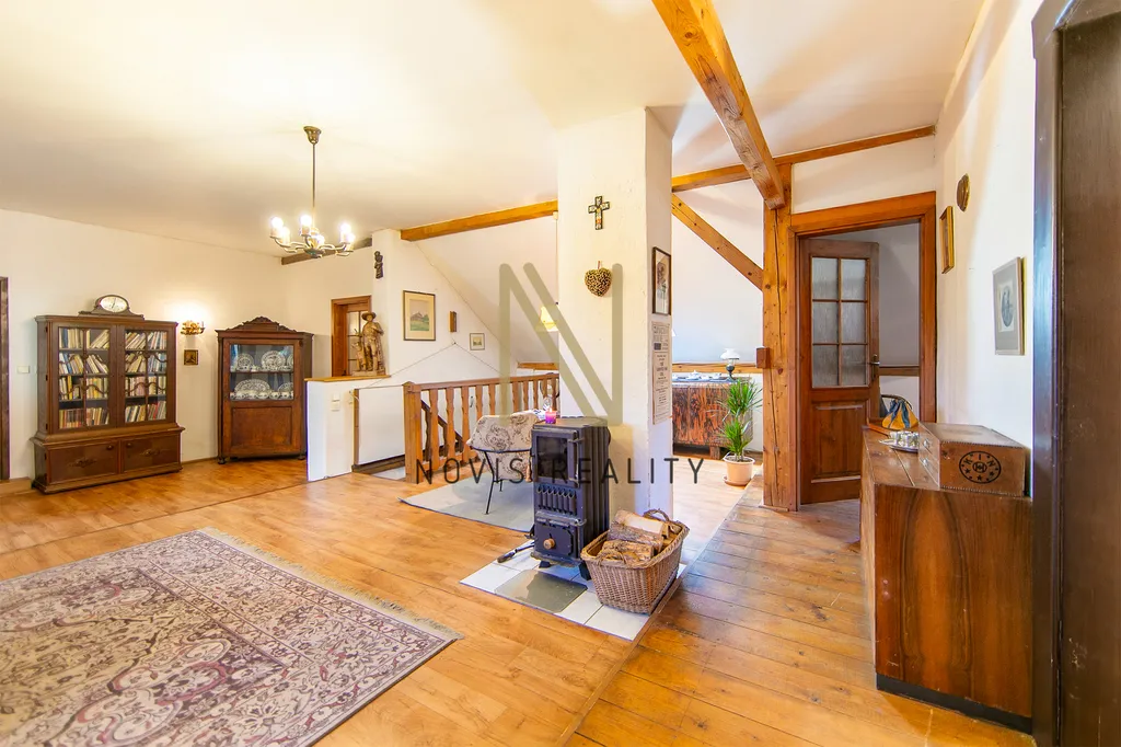 V podkroví je prostorný obývací pokoj, který je ideálním místem pro rodinné setkání a tři pokoje, přičemž jeden z nich disponuje romantickým balkonkem. Dále je zde koupelna se sprchovým koutem, šatna a půdní prostory, které přímo vybízí k vestavbě. K dispozici jsou dva sklepy o velikosti 9 m² a 14 m². Dům je celkově v dobrém stavu a je připraven na to, aby se v něm vytvořil nový domov.