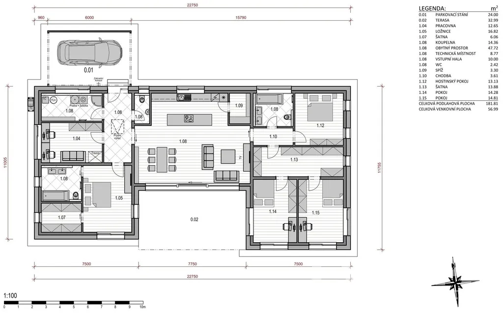 5 samostatných pokojů: ložnice s nadstandartní šatnou (14 m²), 2 dětské pokoje, pracovna a pokoj pro hosty.