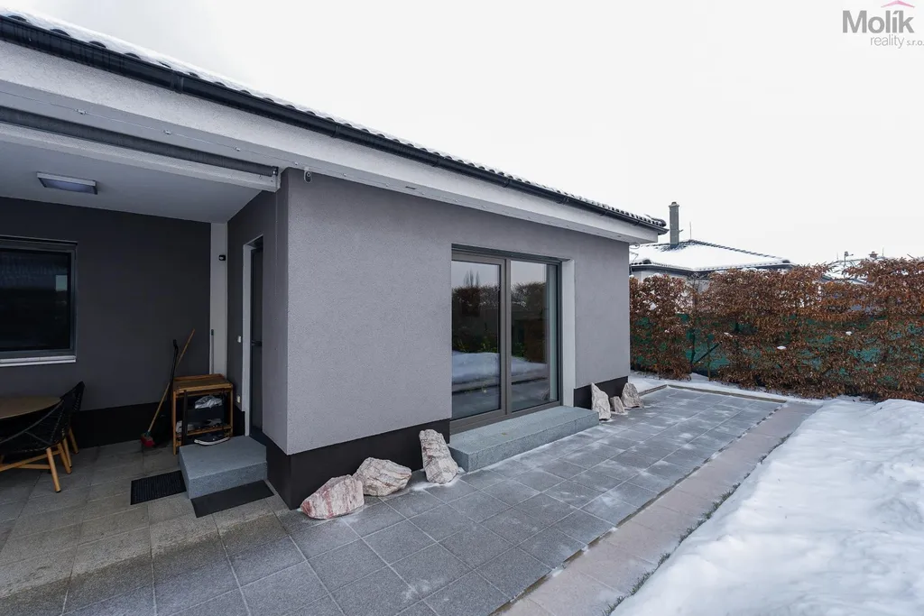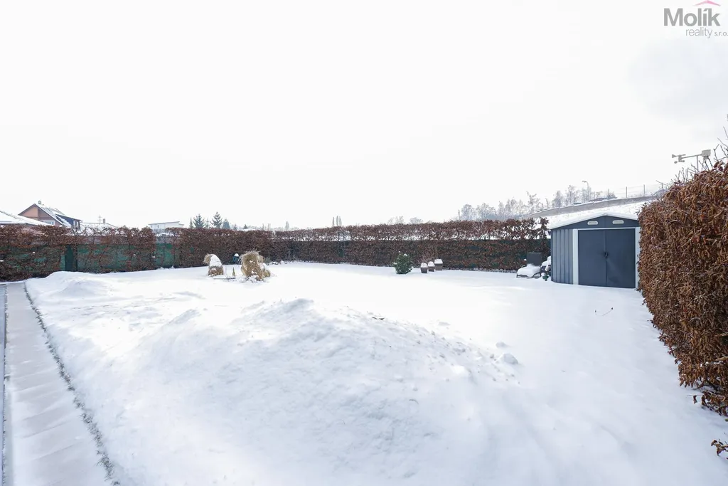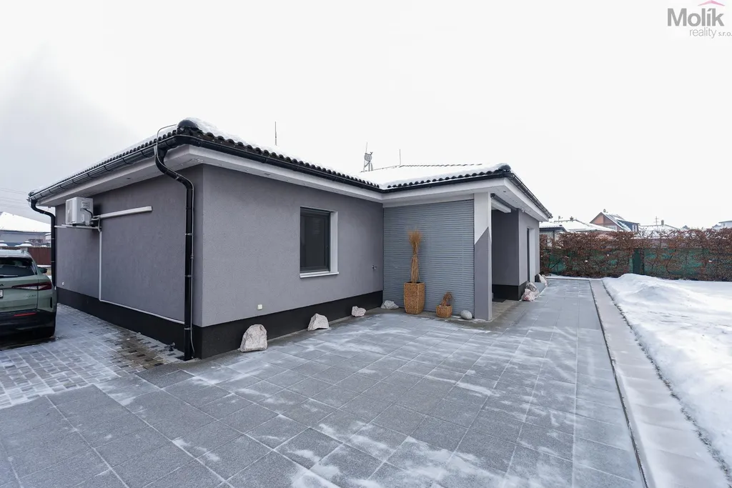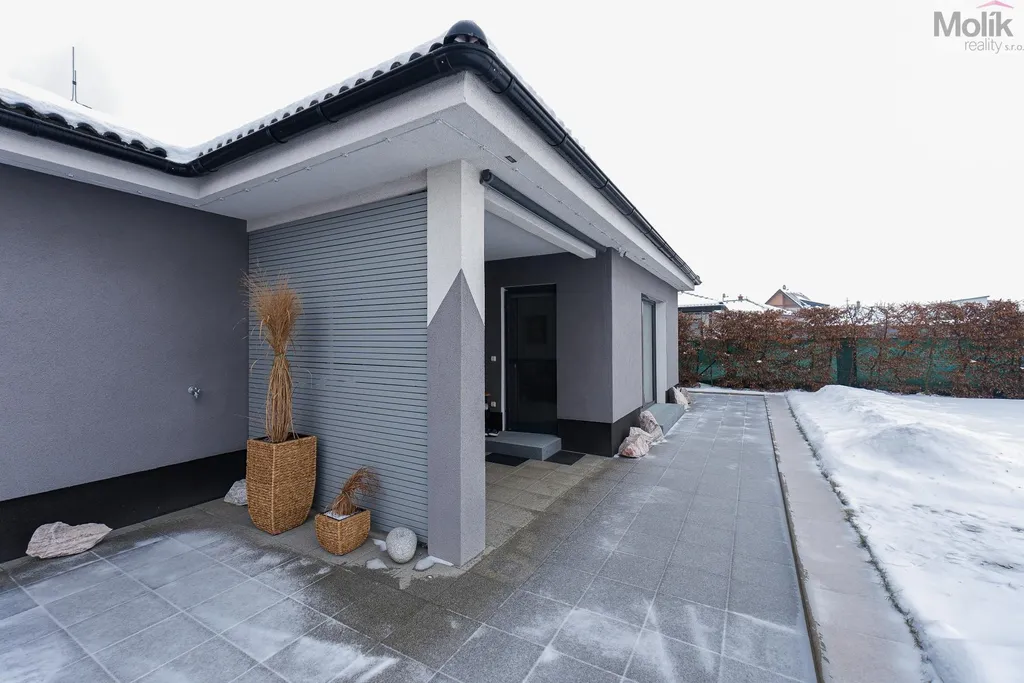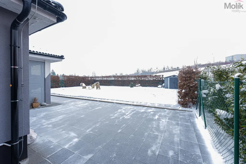Celý pozemek je oplocen a kolem domu vydlážděn zámkovou dlažbou. Dům je vybaven dálkově ovládanou pojízdnou bránou a nabízí parkování pro tři vozy. Zastřešená terasa s roletou. Předzahrádka je pečlivě upravená a osázena okrasnými keři.