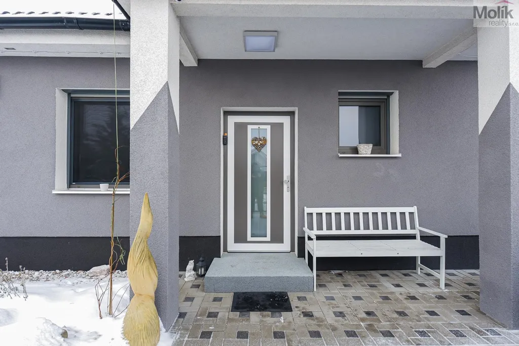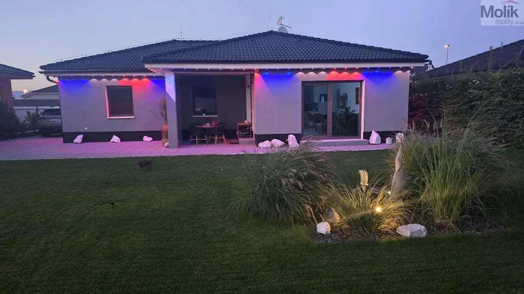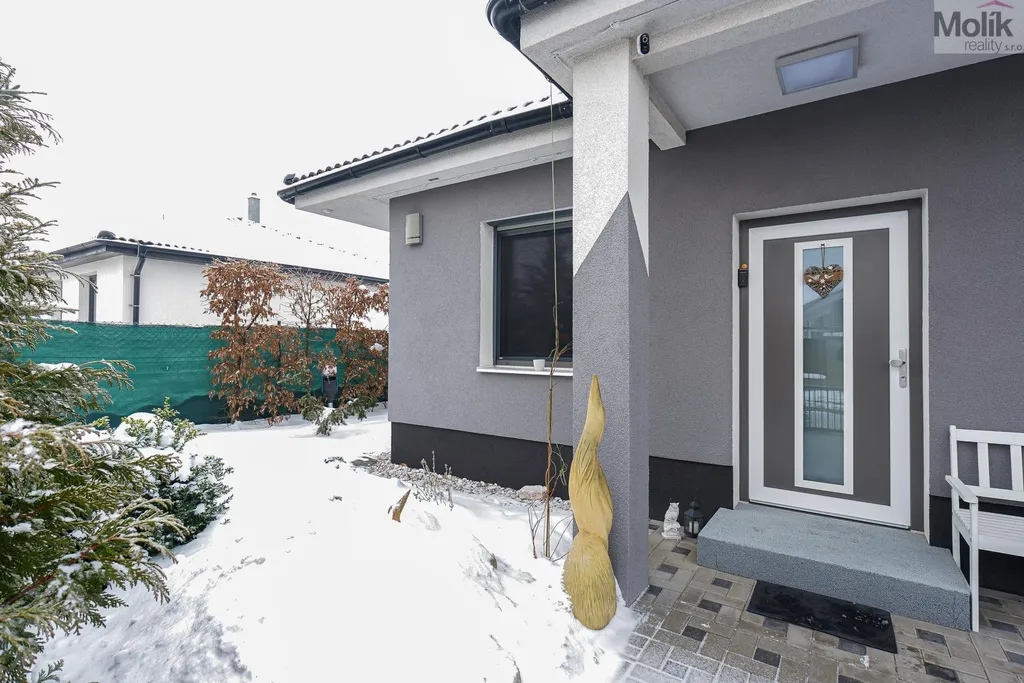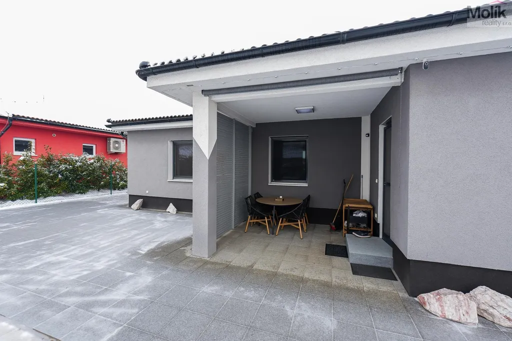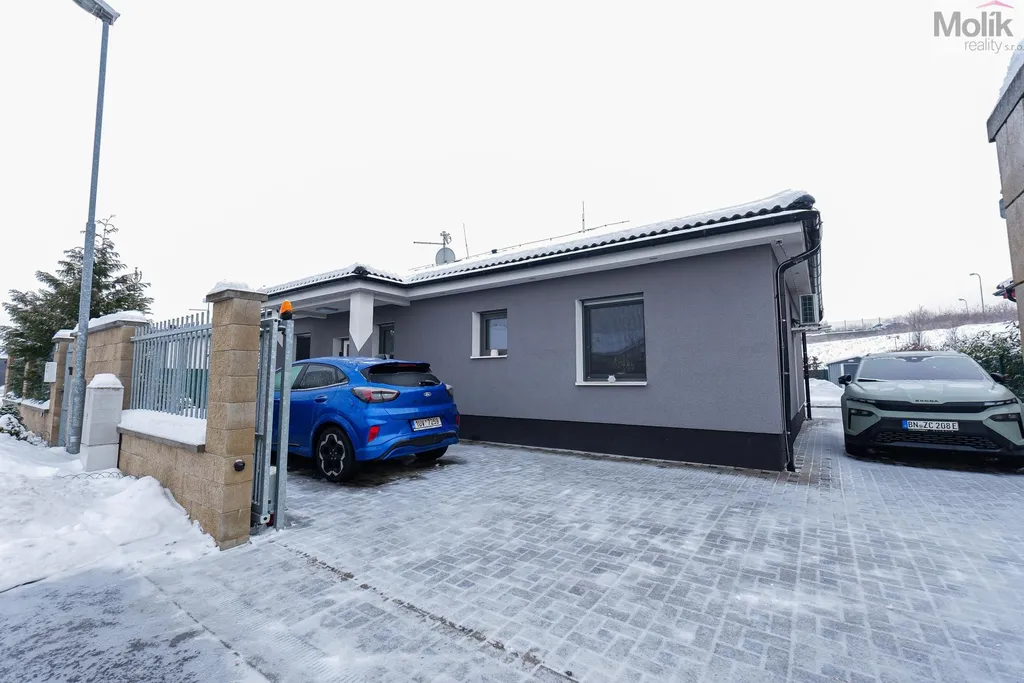 Celý pozemek je oplocen a kolem domu vydlážděn zámkovou dlažbou. Dům je vybaven dálkově ovládanou pojízdnou bránou a nabízí parkování pro tři vozy. Zastřešená terasa s roletou. Předzahrádka je pečlivě upravená a osázena okrasnými keři.
