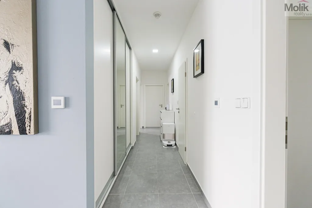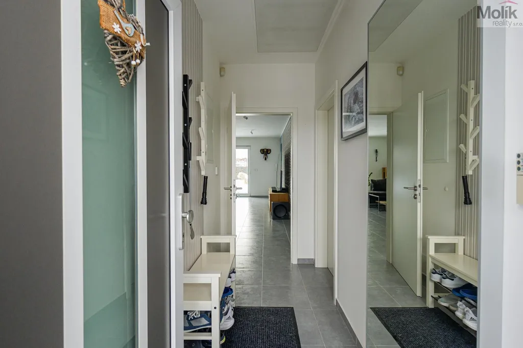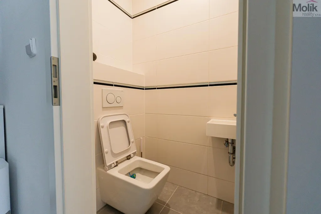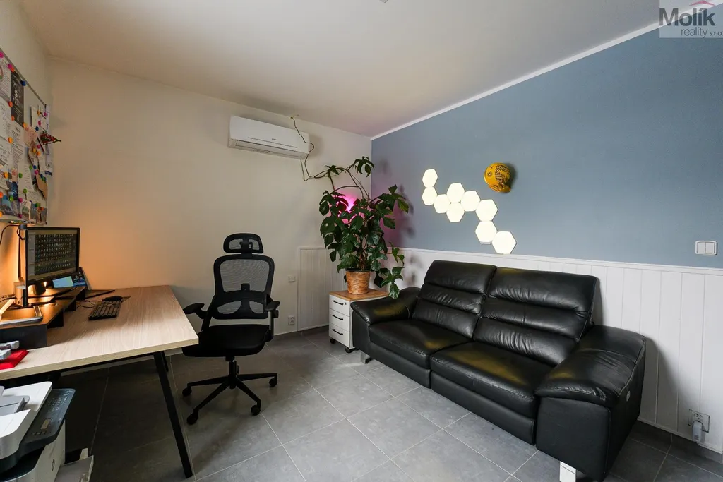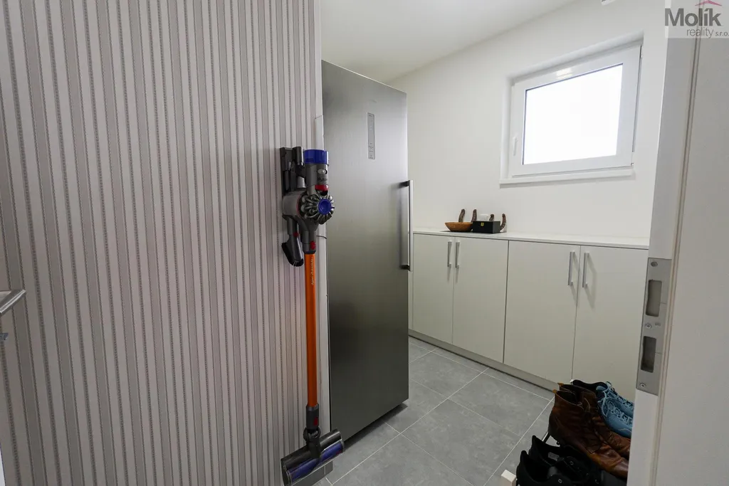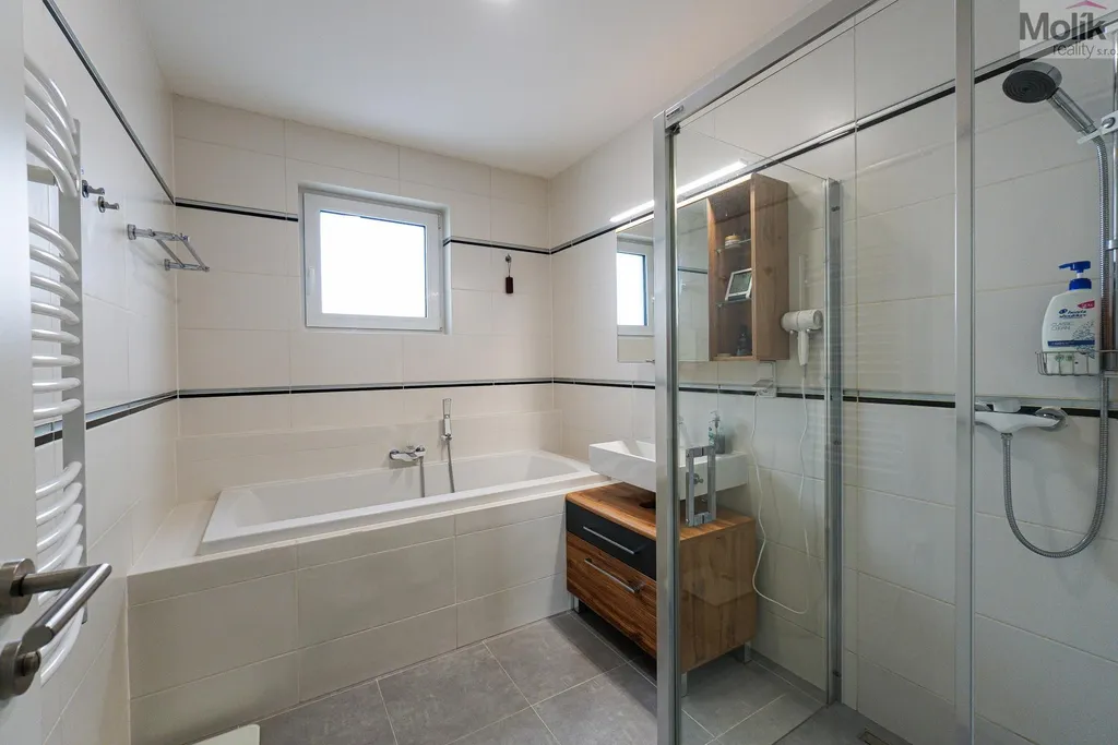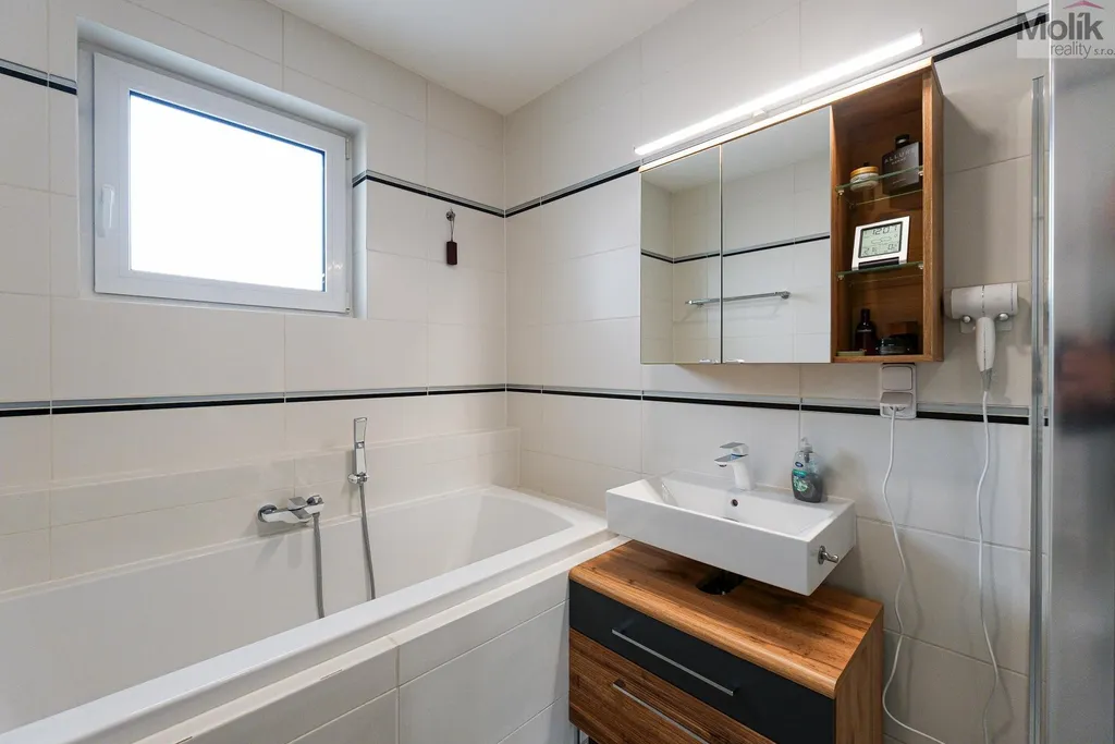 Koupelna je provedena ve velkoformátovém obkladu a nabízí jak sprchový kout, tak vanu. Samozřejmostí je žebříkové topení, umývadlová skříňka a zrcadlová skříňka. Praktická šatna je vybavena vestavnými skříněmi s dostatkem úložného prostoru a aktuálně slouží také jako pracovna, přičemž ji lze využít i jako další pokoj. Technická místnost je vybavena elektrickým bojlerem na ohřev vody a WC je řešeno samostatně.