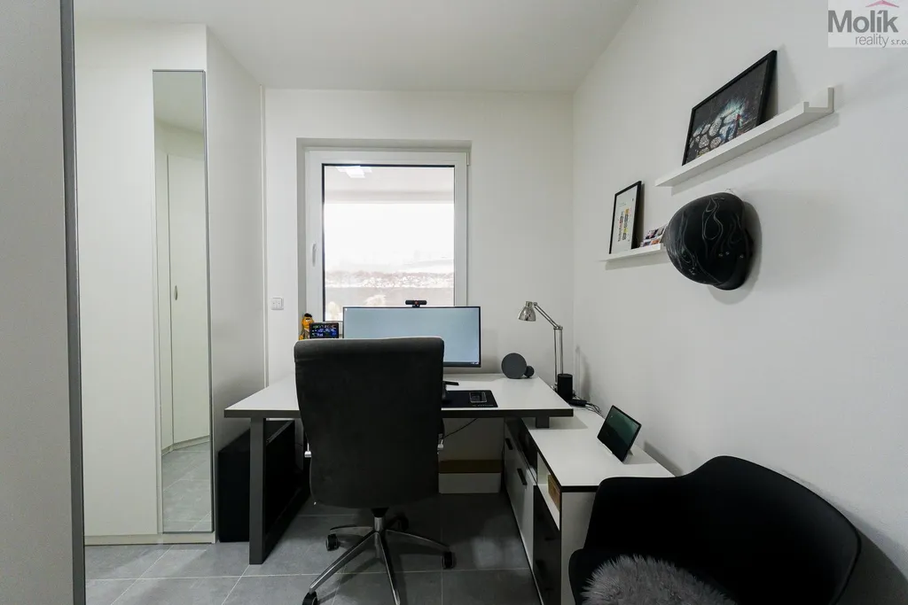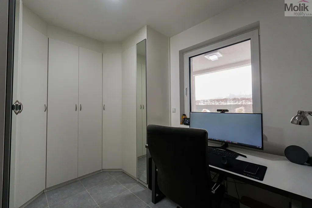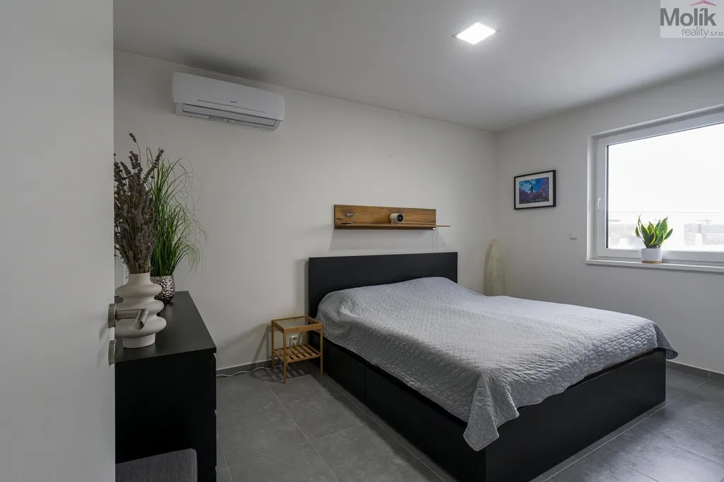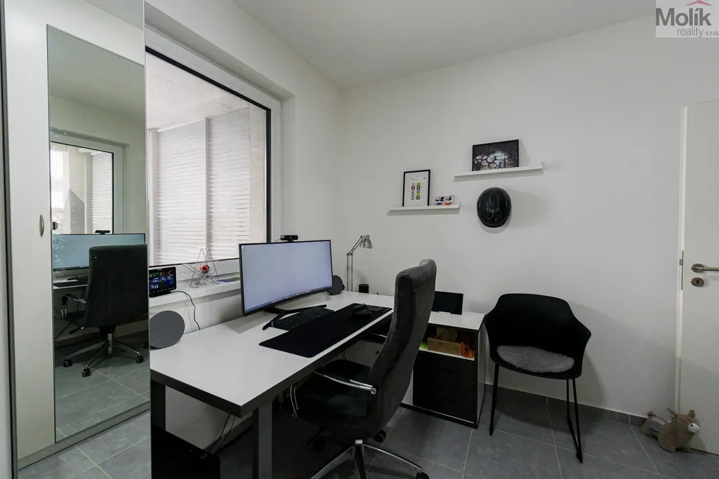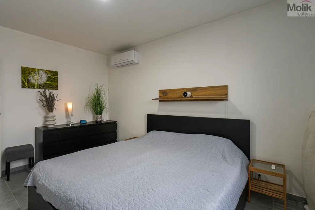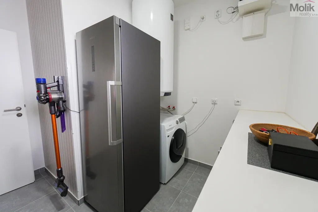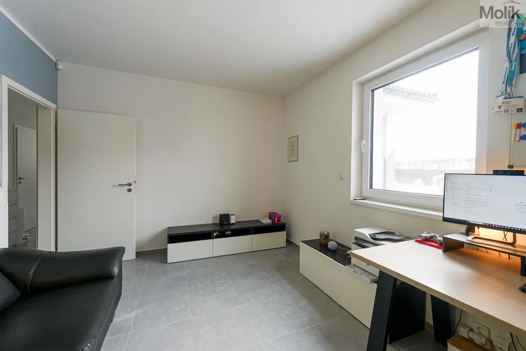 Koupelna je provedena ve velkoformátovém obkladu a nabízí jak sprchový kout, tak vanu. Samozřejmostí je žebříkové topení, umývadlová skříňka a zrcadlová skříňka. Praktická šatna je vybavena vestavnými skříněmi s dostatkem úložného prostoru a aktuálně slouží také jako pracovna, přičemž ji lze využít i jako další pokoj. Technická místnost je vybavena elektrickým bojlerem na ohřev vody a WC je řešeno samostatně.
