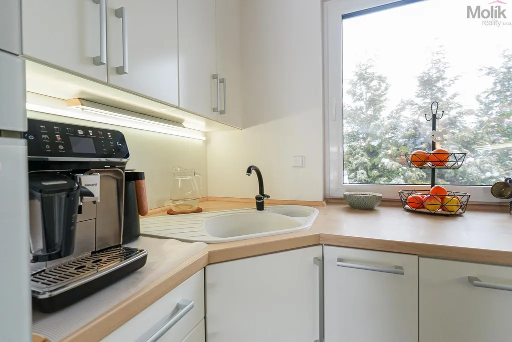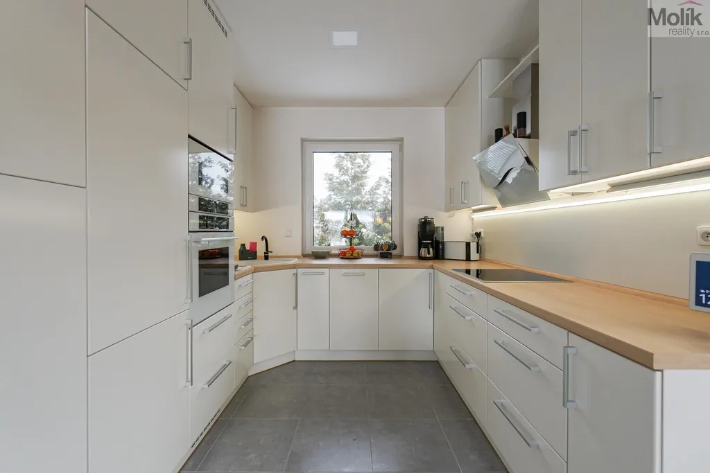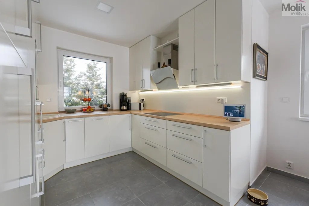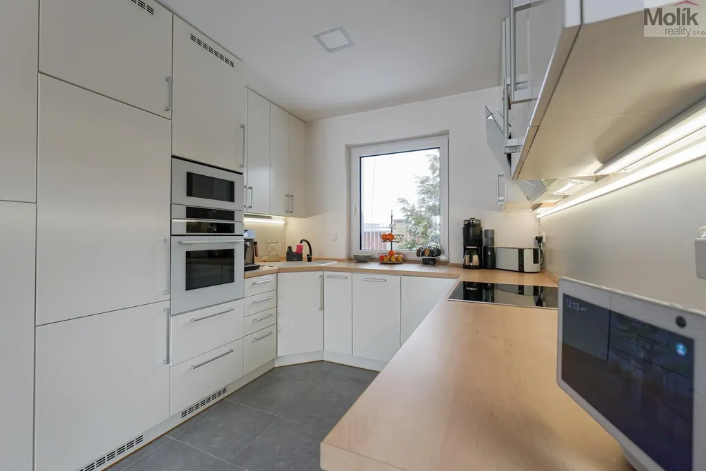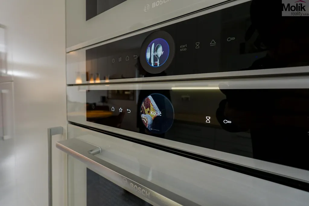 Interiér domu je velmi dobře dispozičně řešený, prostorný a vzdušný. Dominantou je světlý obývací pokoj propojený s plně vybaveným kuchyňským koutem. Součástí je moderní bílá kuchyňská linka ve tvaru U s novými spotřebiči značky Bosch, mezi které patří plně integrovaná myčka nádobí, vestavná parní trouba, mikrovlnná trouba, indukční varná deska, vestavná chladnička a digestoř s recirkulací.