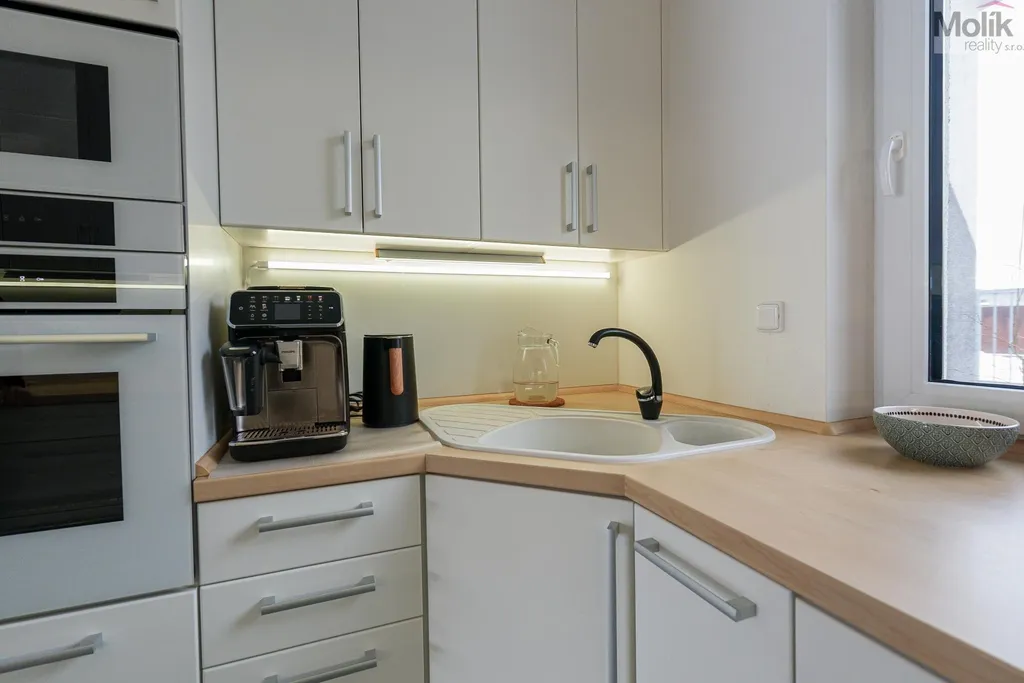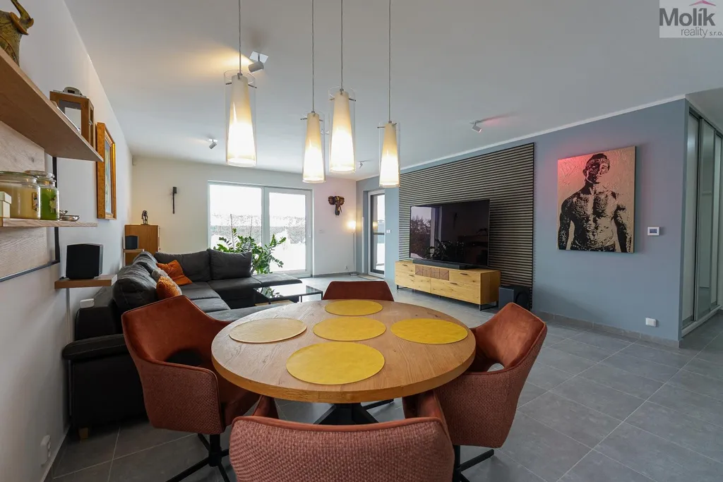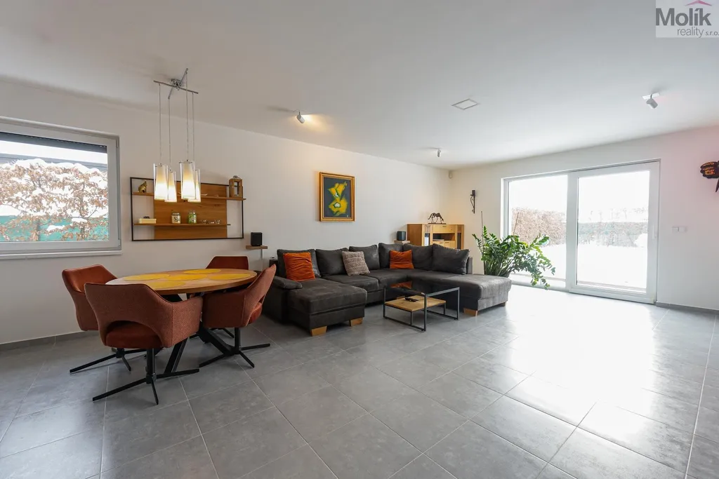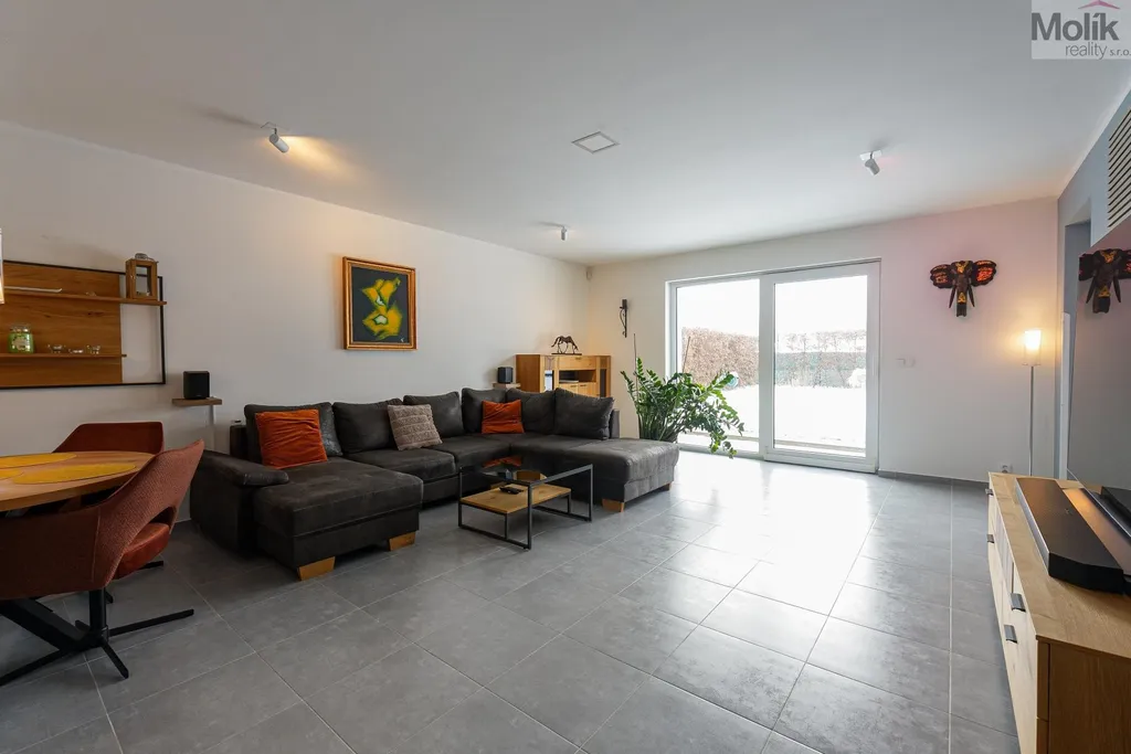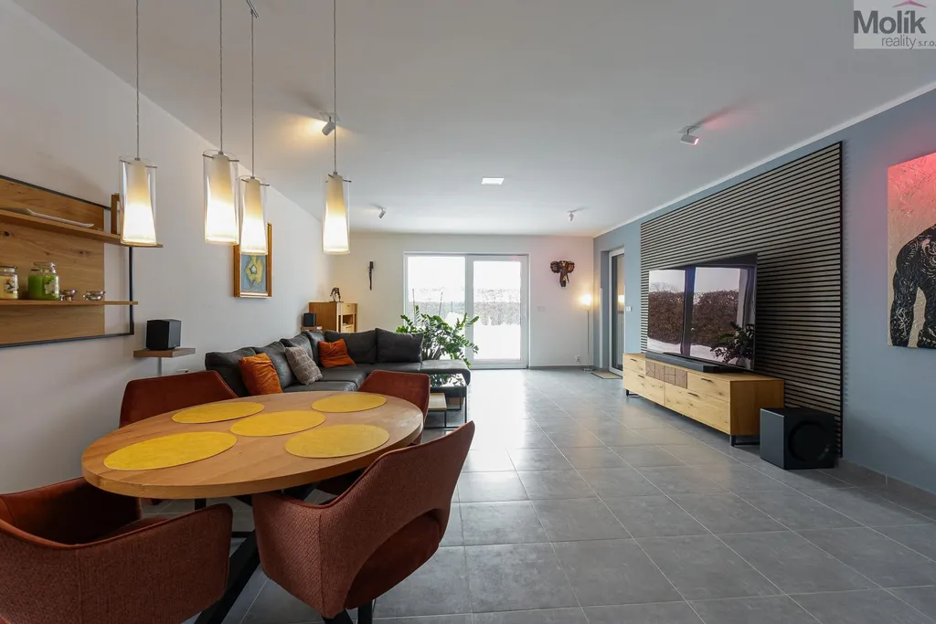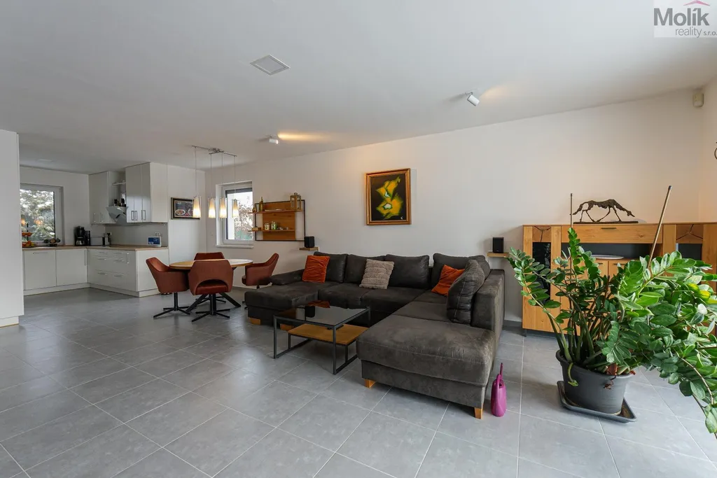 Interiér domu je velmi dobře dispozičně řešený, prostorný a vzdušný. Dominantou je světlý obývací pokoj propojený s plně vybaveným kuchyňským koutem. Součástí je moderní bílá kuchyňská linka ve tvaru U s novými spotřebiči značky Bosch, mezi které patří plně integrovaná myčka nádobí, vestavná parní trouba, mikrovlnná trouba, indukční varná deska, vestavná chladnička a digestoř s recirkulací.