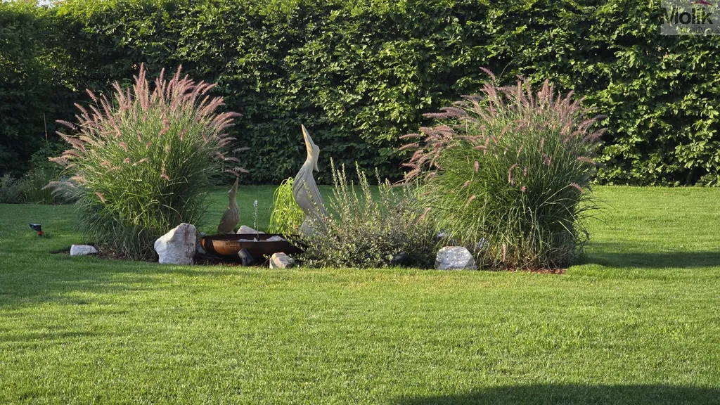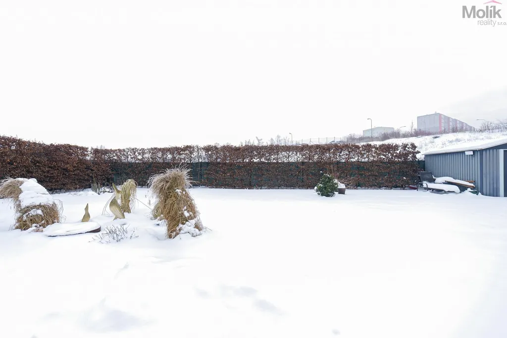 Zahrada domu je upravená a plně připravená k okamžitému využití. Nachází se zde trávníkový koberec s automatickou závlahou, kolem oplocení rostou vzrostlé habry, túje a kavkazské jedle, v zahradě nechybí rybíz, kanadské borůvky ani okrasné trávy, které vytvářejí příjemné a soukromé prostředí.