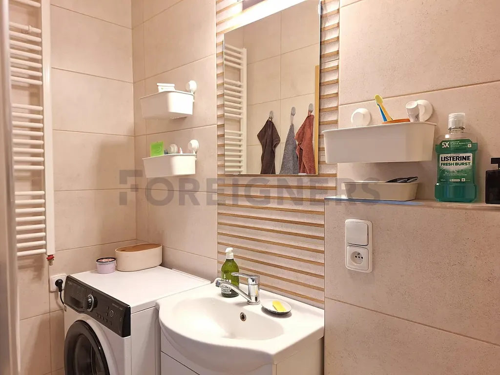 - v koupelně najdete sprchový kout, pračku, umyvadlo se úložnou skříňkou včetně zrcadla a WC