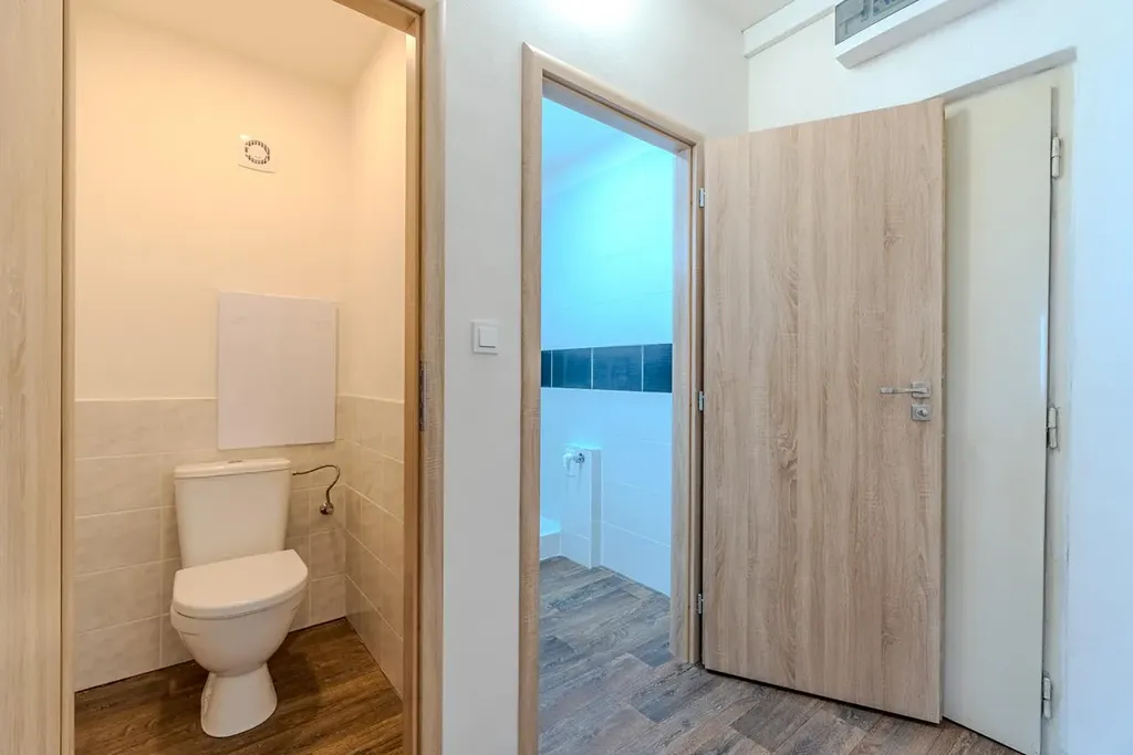 Koupelna je zcela nová, vybavená sprchovacím koutem, umyvadlem s koupelnovou skříňkou, osvětleným zrcadlem a nechybí zde ani přípojka na pračku.