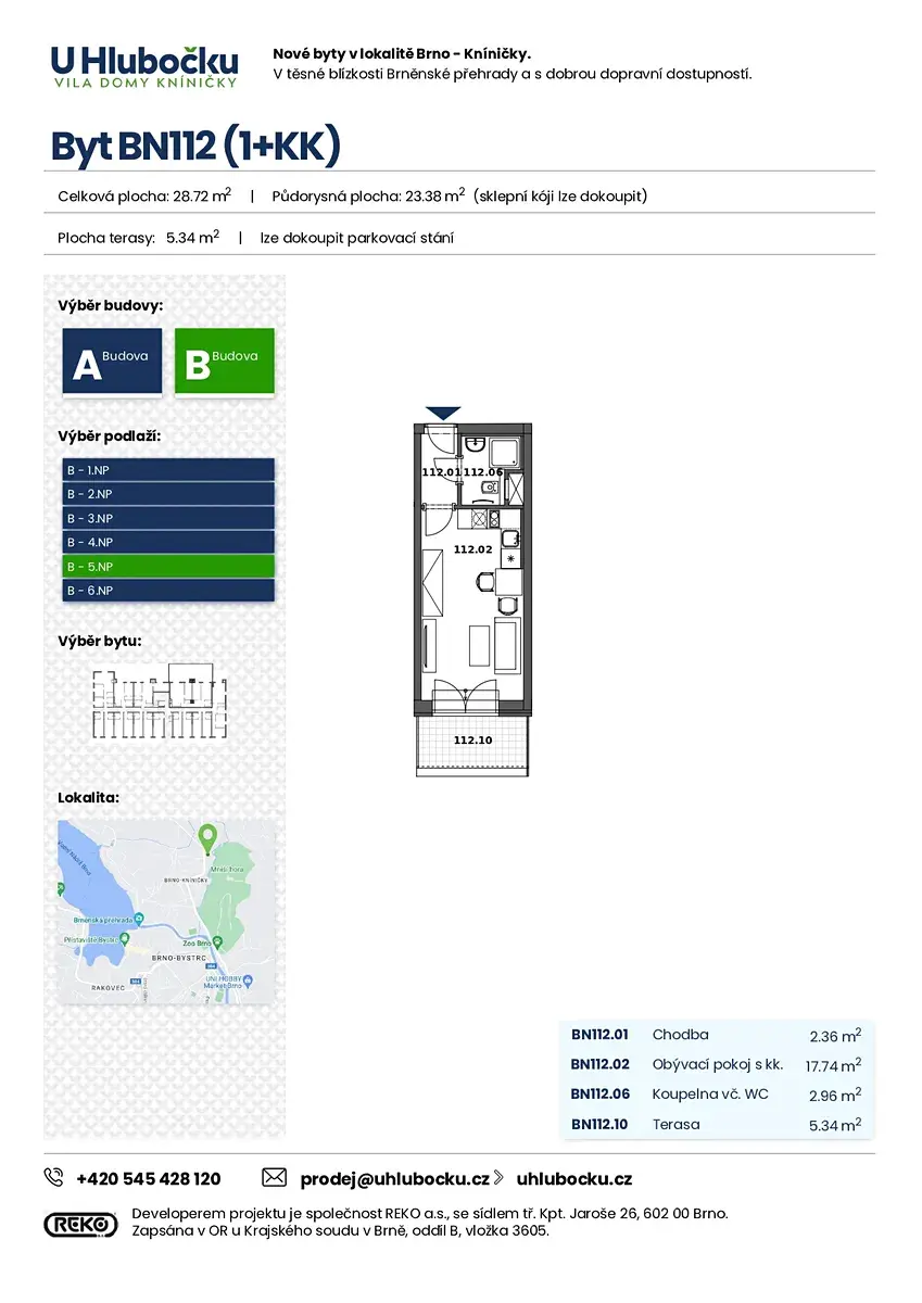 Nabízíme k prodeji byt o velikosti 1+kk (CP je 29 m2) s terasou o vel. 5,34 m2, v lokalitě Brno - Kníničky. Byt se nachází v 1./5.NP moderního terasového viladomu s výtahem - projekt "U Hlubočku" - dům B. Orientace bytu je západ.