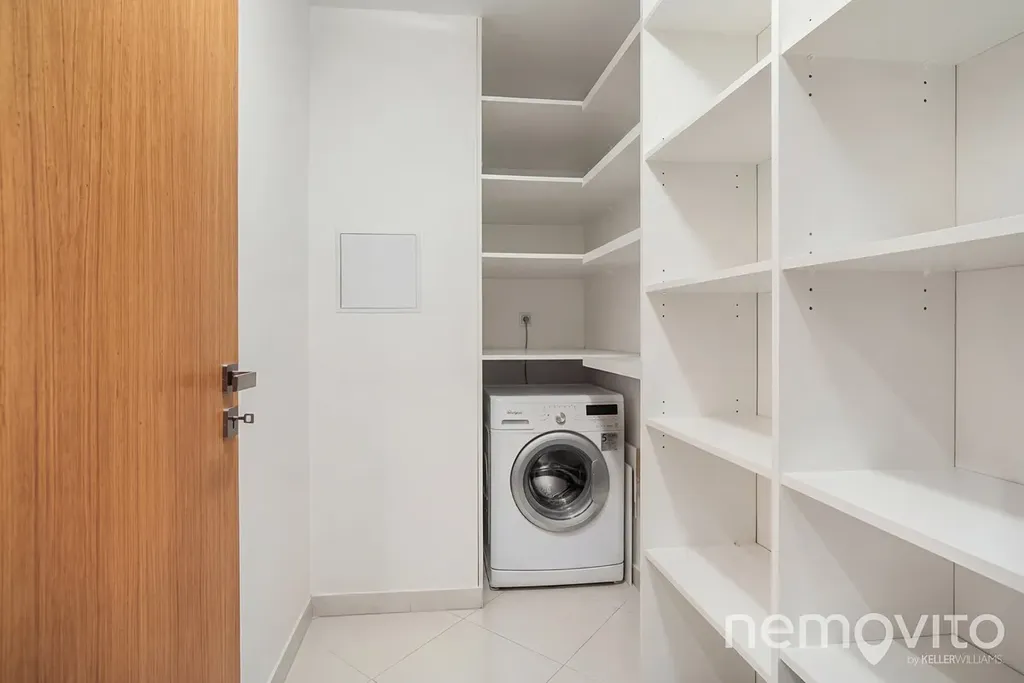 Další úložné prostory nabízí samostatná místnost vybavená policovým systémem s nastavitelnou výškou (walk-in šatna), kde je zároveň umístěna pračka.