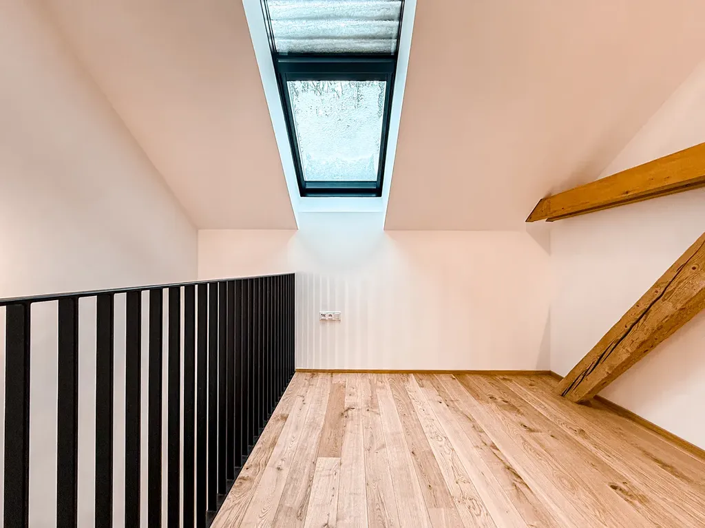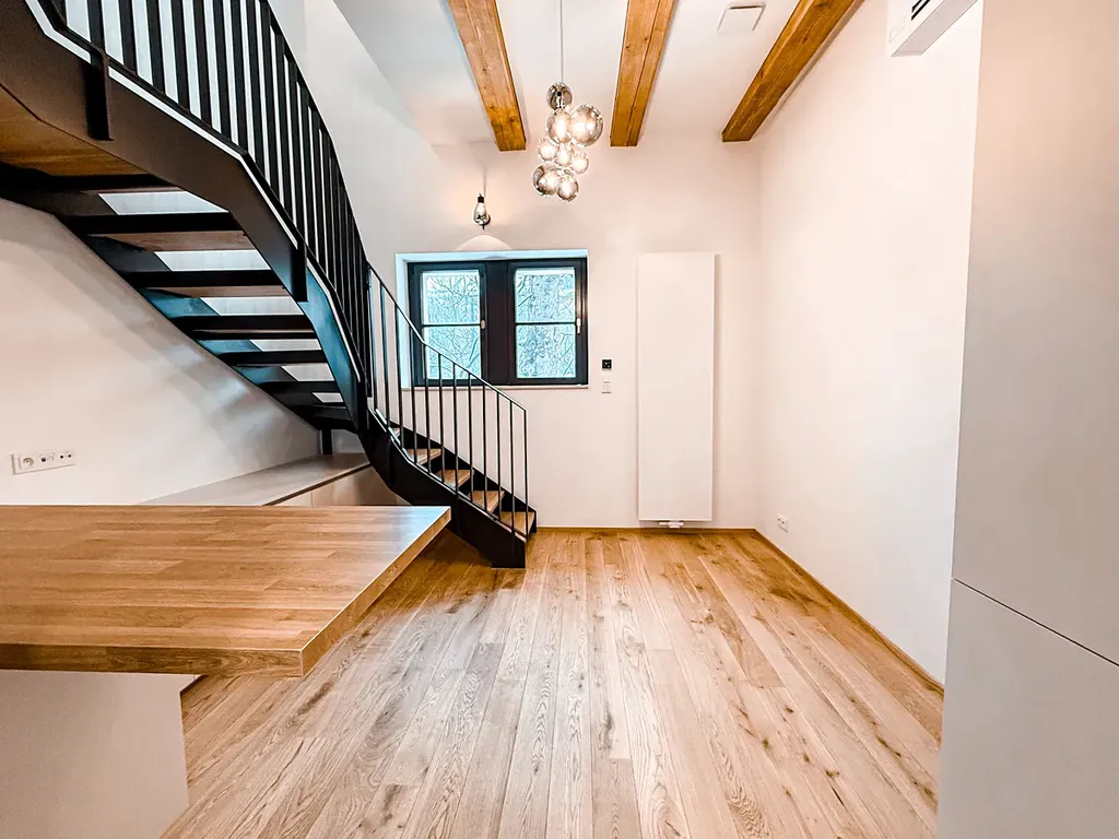 Interiér bytu zaujme otevřeným obytným prostorem, vysokými stropy a přiznanými dřevěnými trámy, které odkazují na industriální historii budovy. Masivní dřevěné podlahy dodávají prostoru teplo a nadčasový charakter.